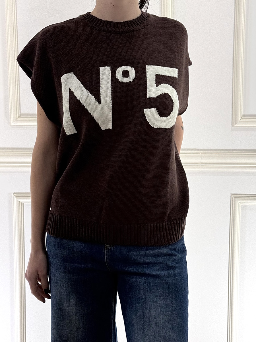 Gilet smanicato con n ° 5 in contrasto sul davanti , capo versatile e Texture morbida.