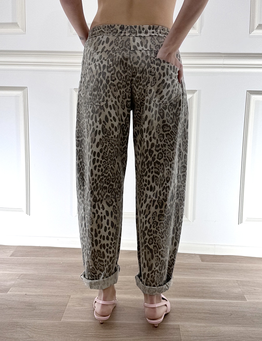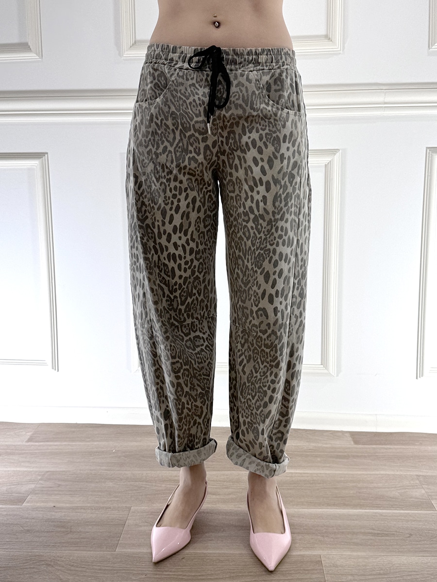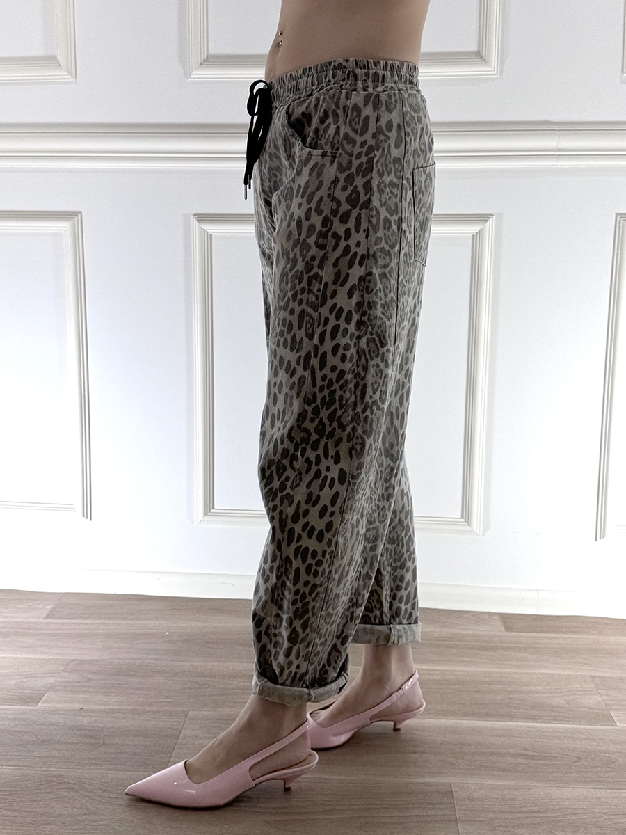 Pantalone con coulisse ed elastico in vita , stampa animalier , vestibilità comoda, tasche per un look rilassato.