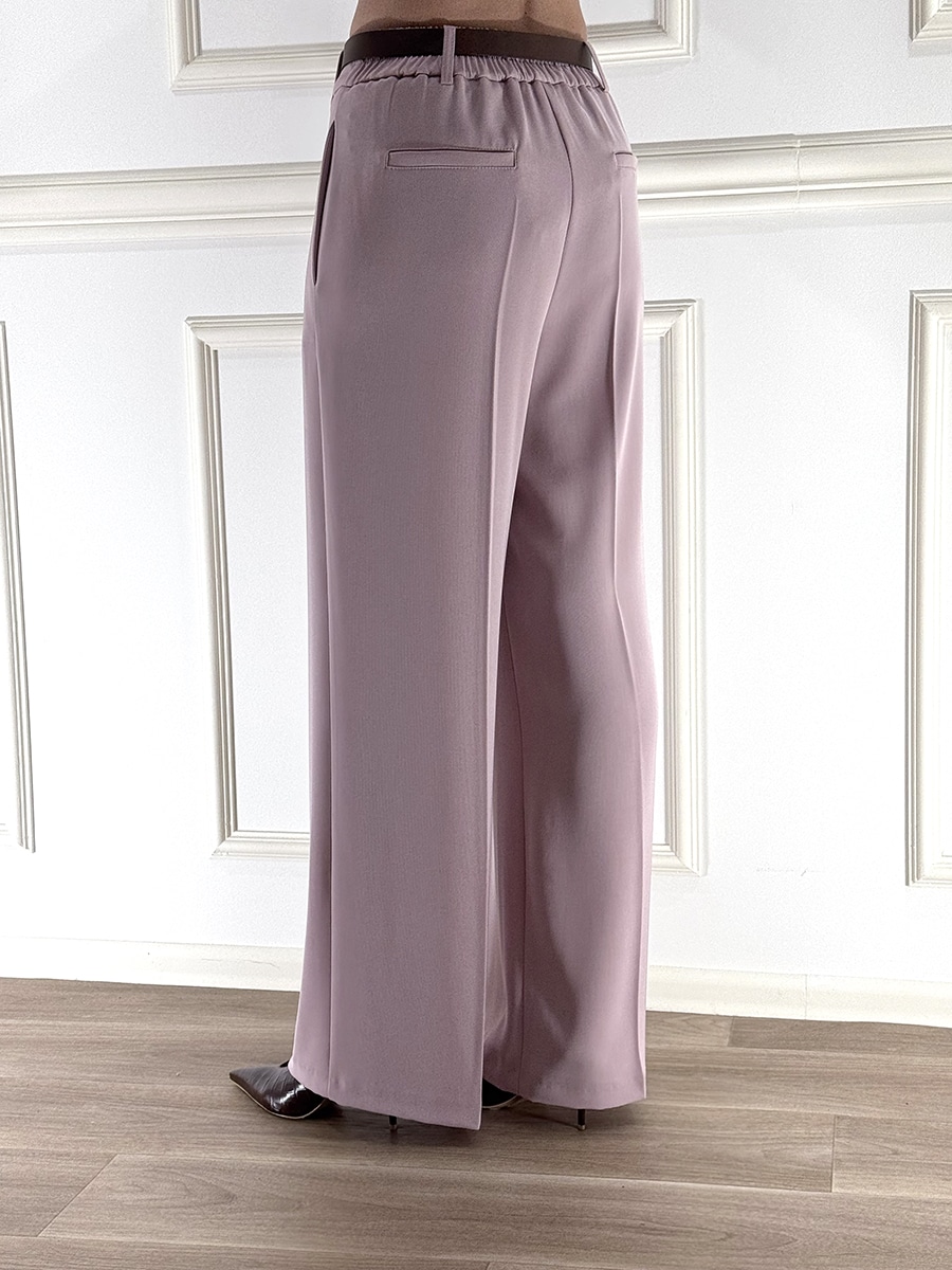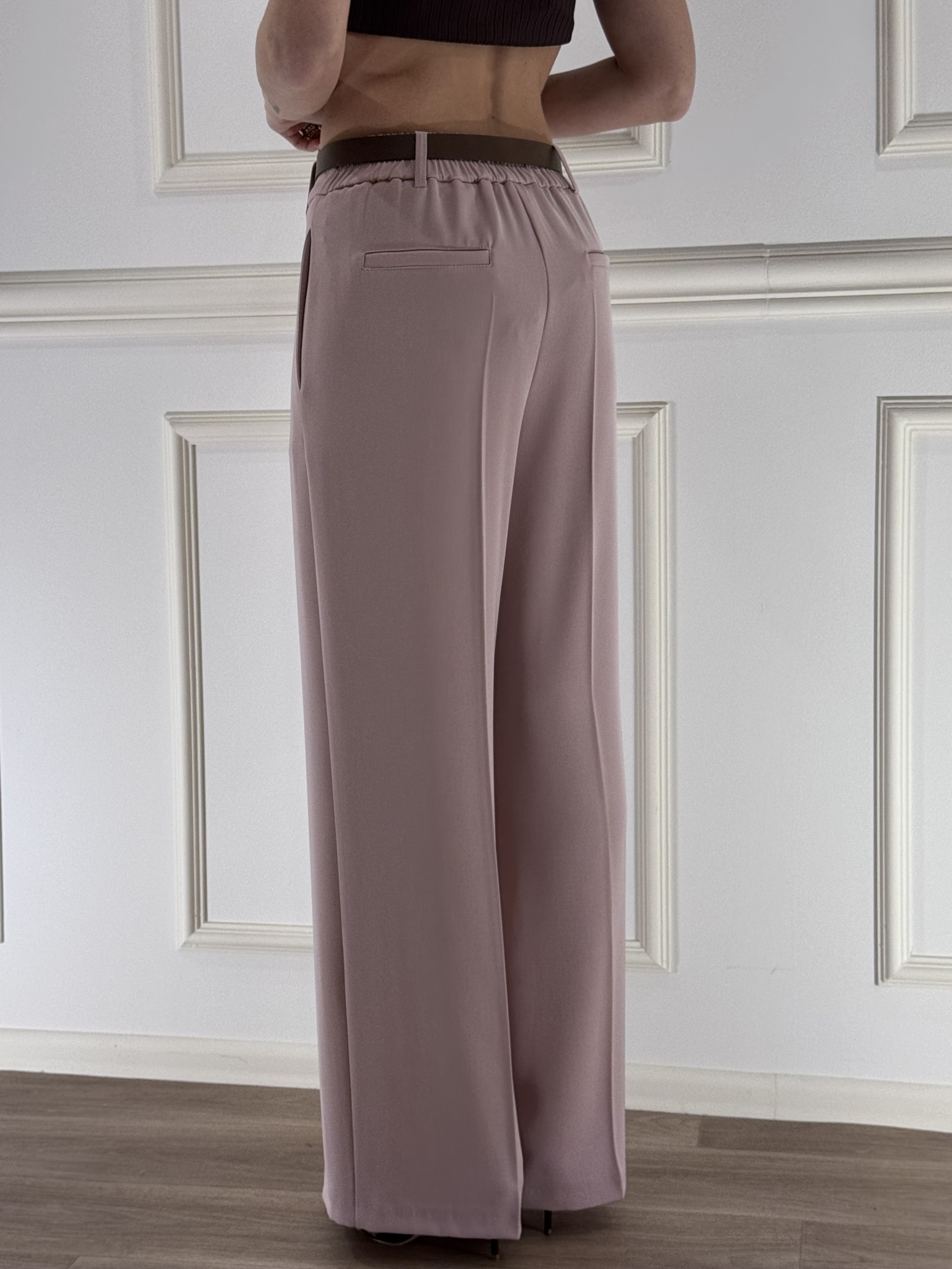 Pantalone modello palazzo , tessuto fluido , zip e bottone davanti per la chiusura , elastico in vita dietro per il massimo comfort.