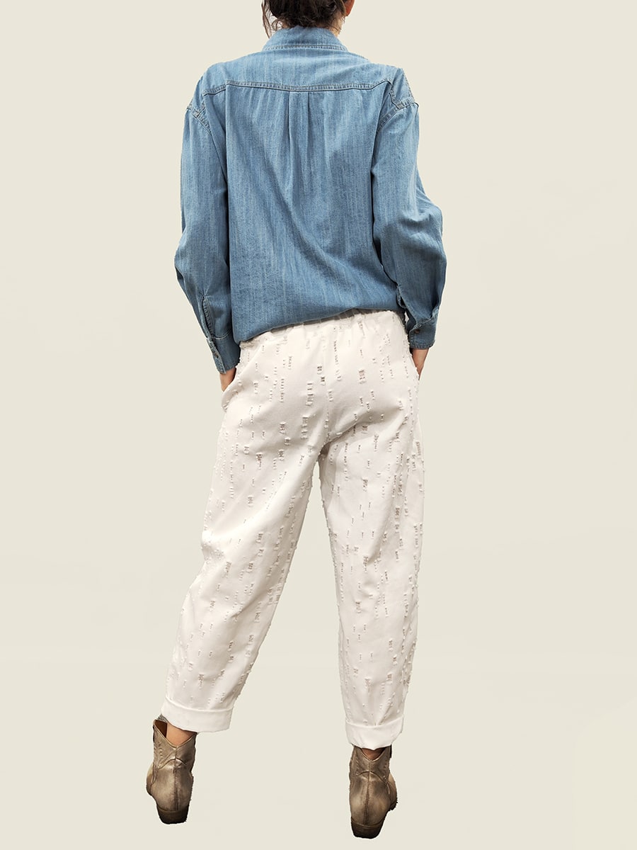 PANTALONI CON MICROROTTURE, ELASTICO SUL RETRO E CINTURINO CON STRASS.