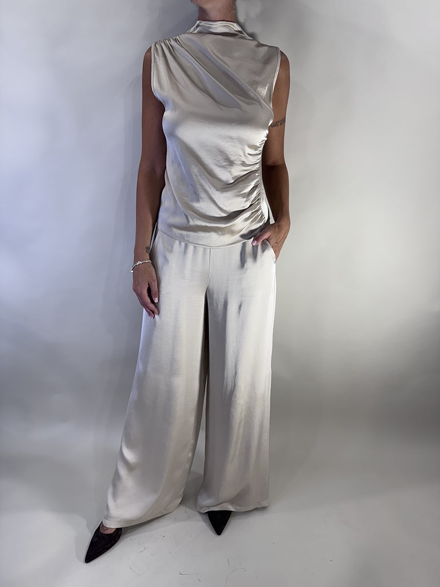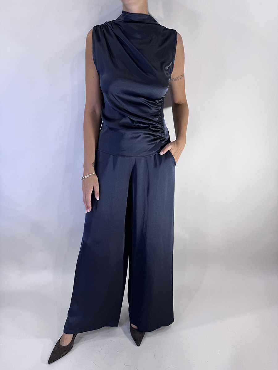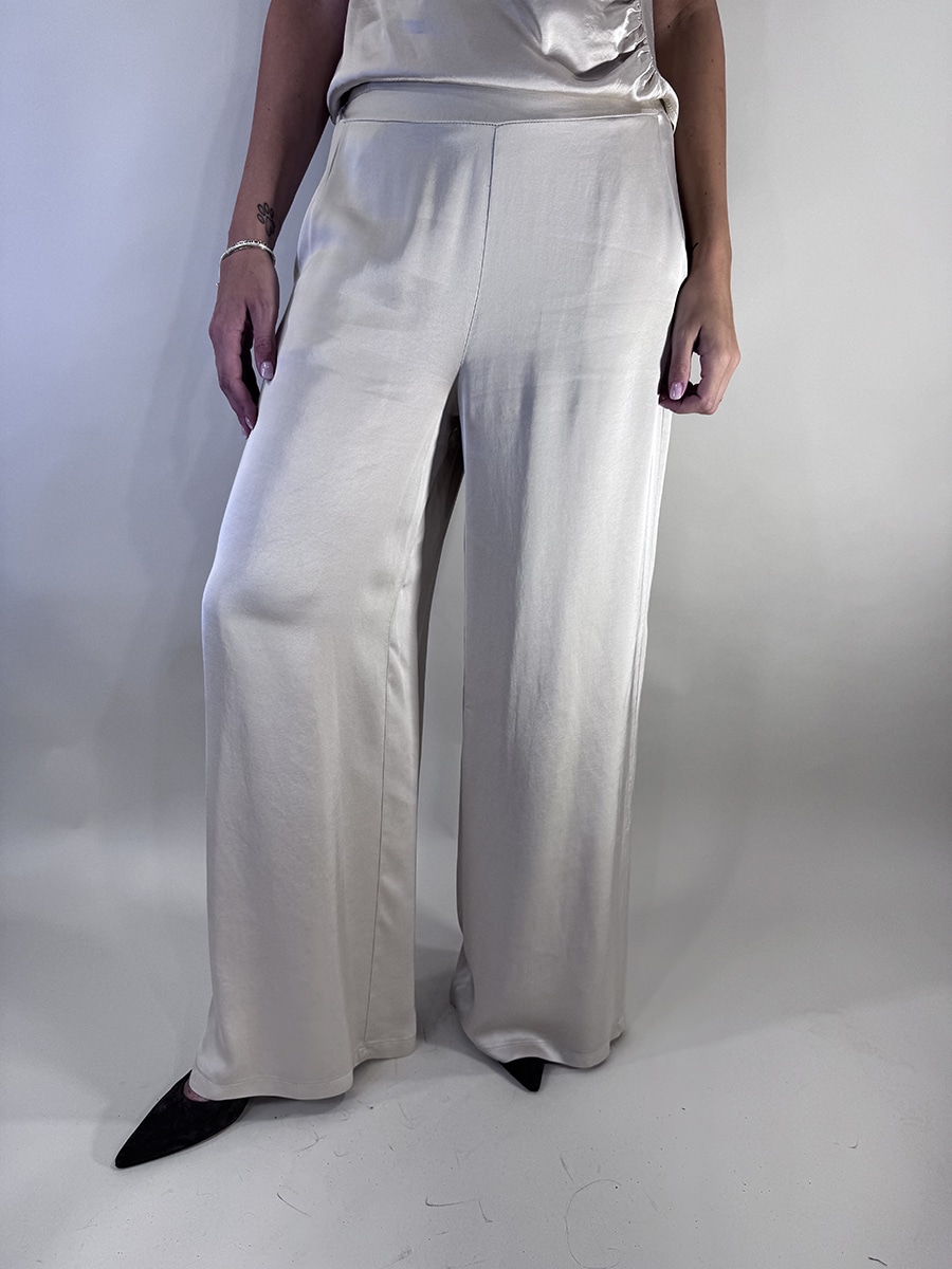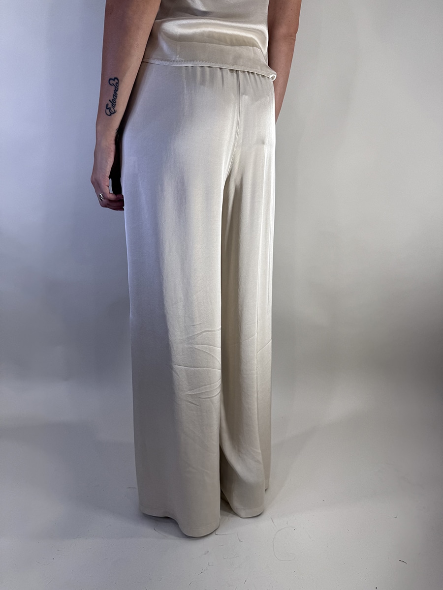 Pantaloni ampi in raso, a vita alta con linea fluida e caduta morbida, elastizzati in vita. Disponibili nelle varianti blu, sabbia e cashe