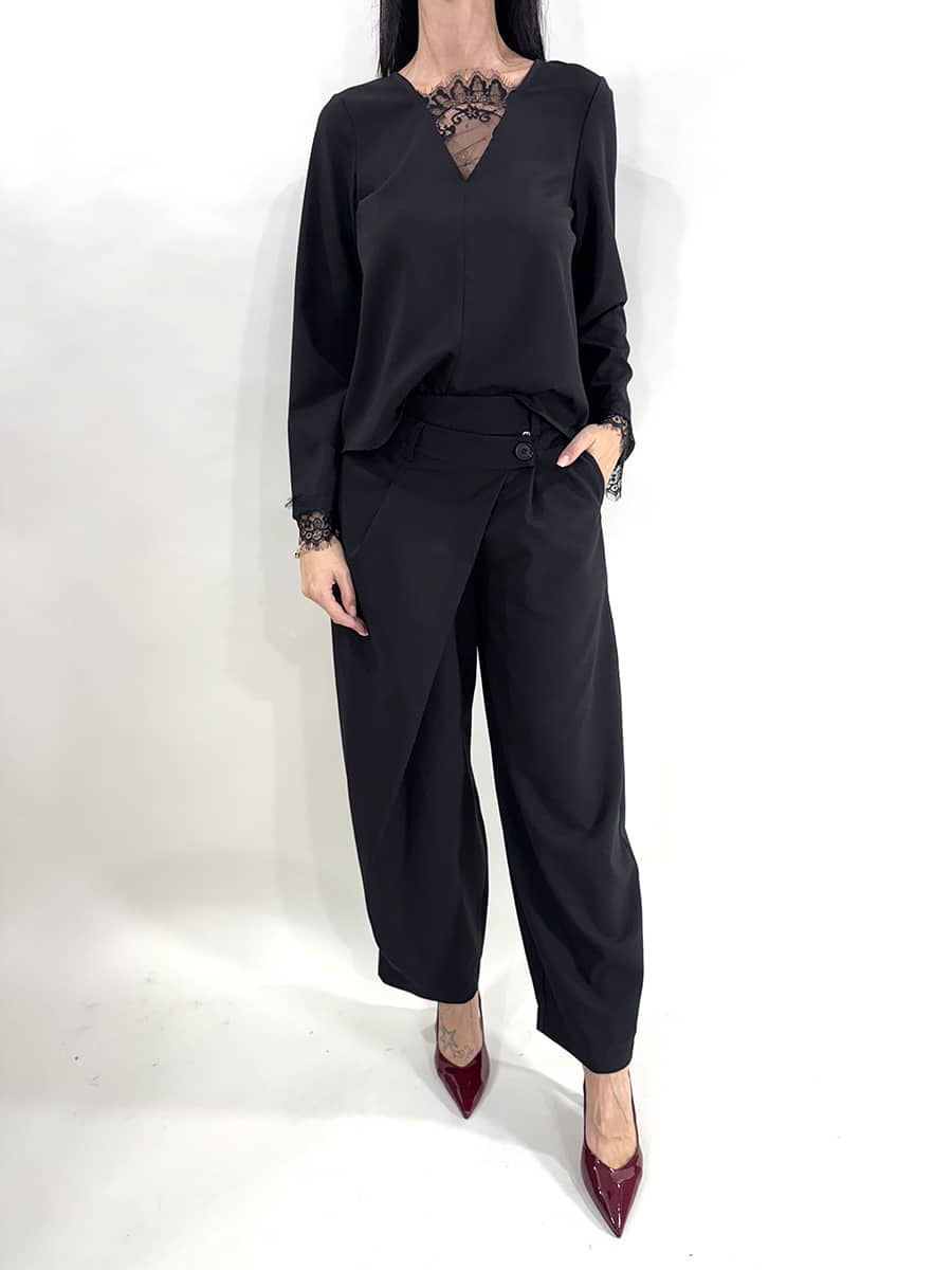 Gamba larga e dritta, scende fluida e crea movimento. Chiusura frontale bottone interno. Piegatura asimmetrica che si sovrappone sul davanti, aggiungendo un tocco originale e sofisticato.
