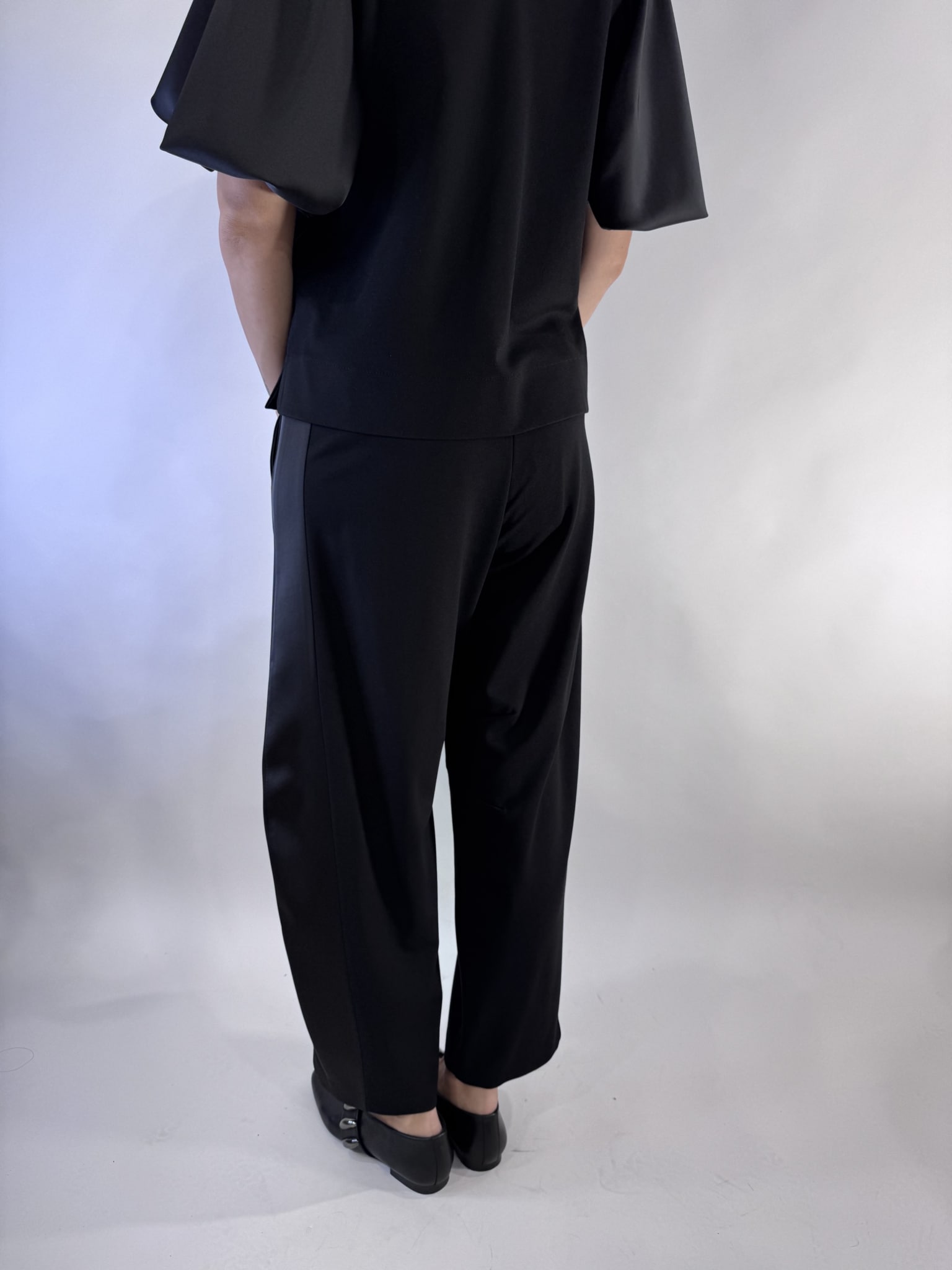 Pantalone nero con inserti in raso , modello a uovo , perfetto abbinato alla sua felpa. Tessuto morbido. Tasca alla francese