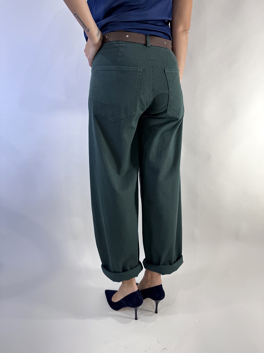 vita media con linea morbida. Tasche anteriori e posteriori, zip e bottone per la chiusura, passanti per la cintura.