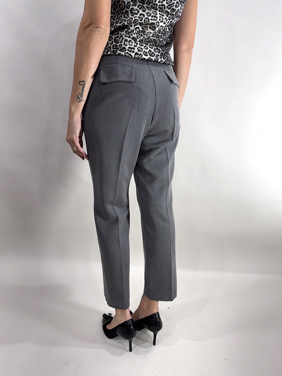 Pantalone con pences frontali a gamba dritta. Vita media con cintura in dotazione, taglio classico e versatile, perfetto sia per look da ufficio che per outfit eleganti, Disponibile nelle varianti blu e grigio.