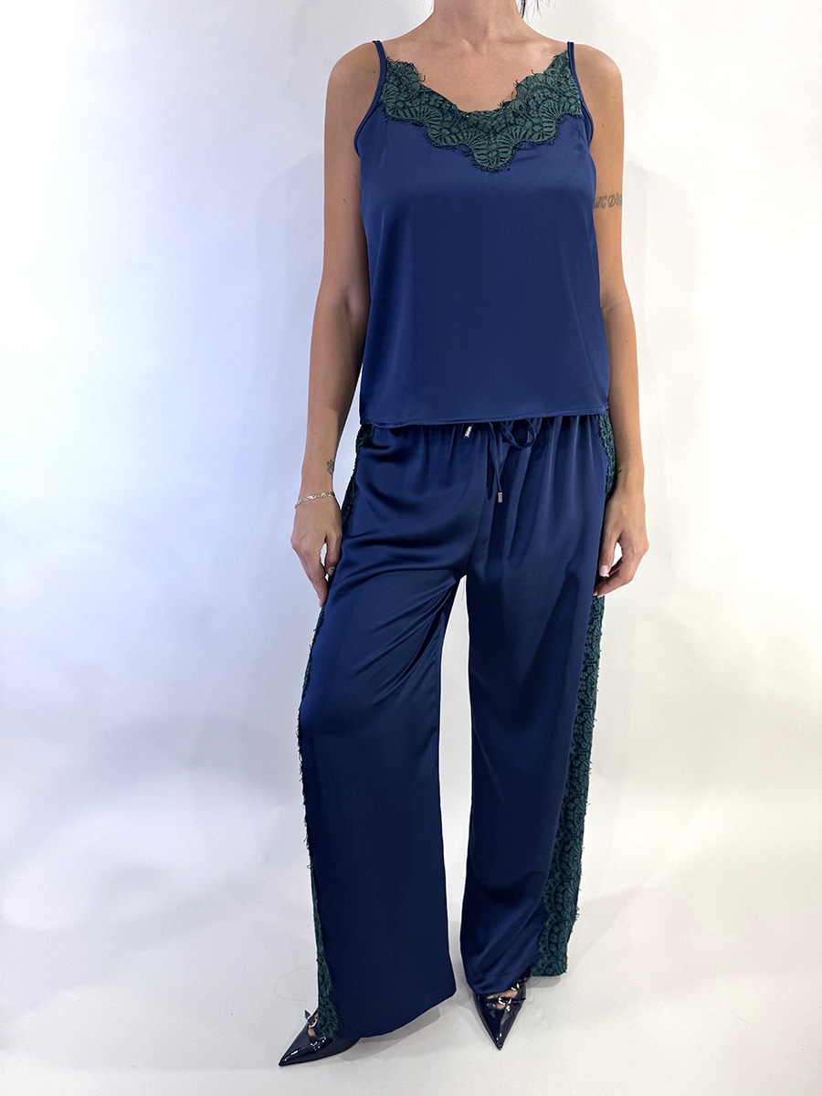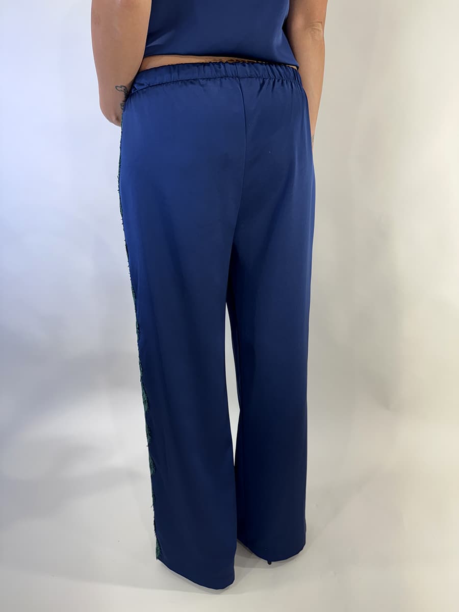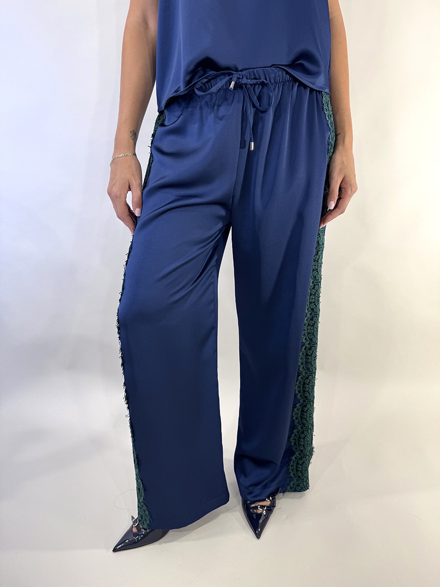 Pantalone in raso tessuto lucido, elastico in vita e coulisse, gamba larga .Banda in pizzo in contrasto