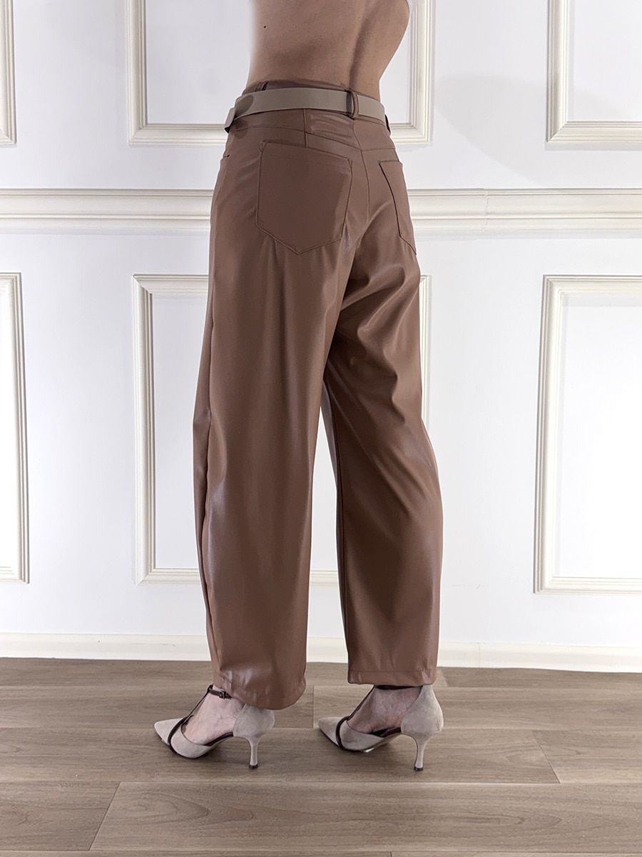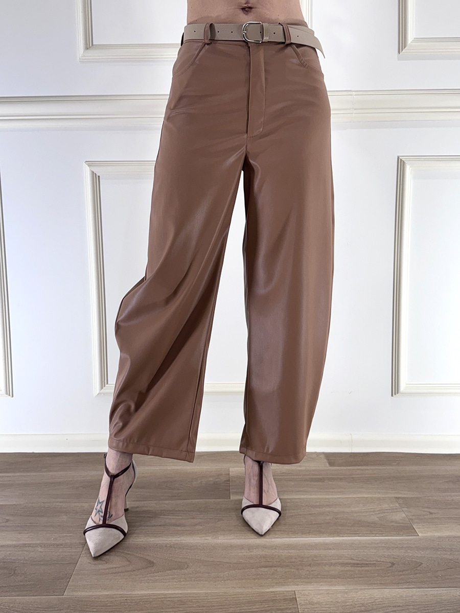 Pantalone balloon in ecopelle con cintura. Chiusura frontale con zip e bottone. Tasche laterali e tasche posteriori applicate. Cintura in dotazione , perfetto abbinato al suo gilet per un look moderno. vestibilità regolare.