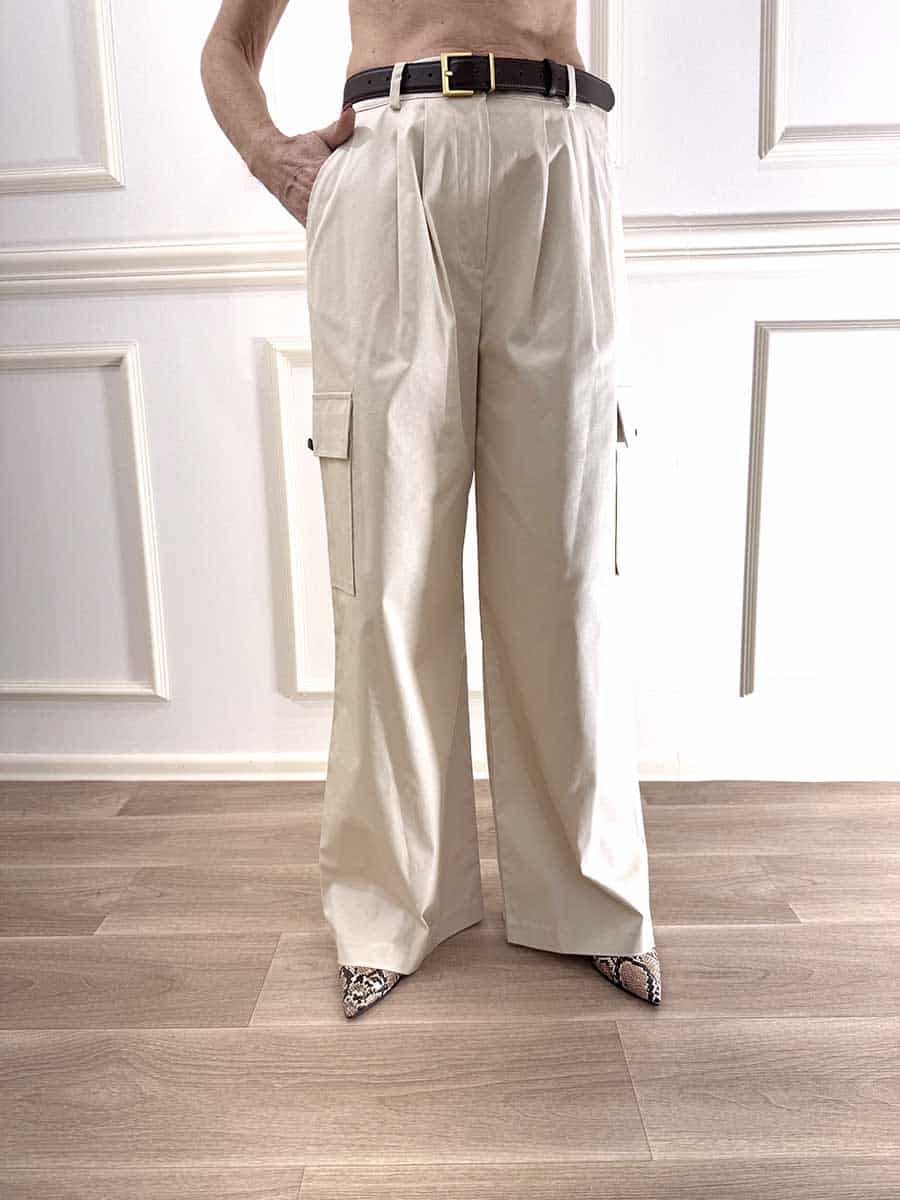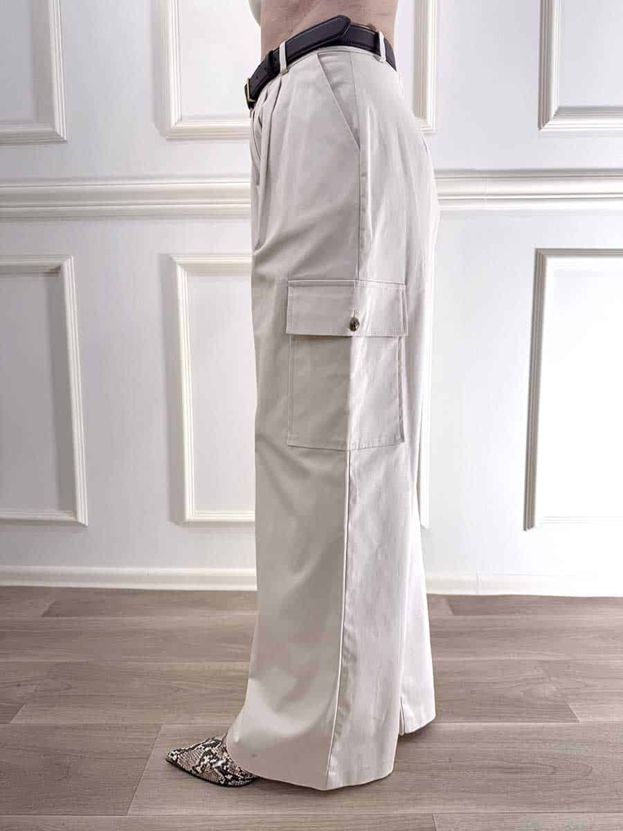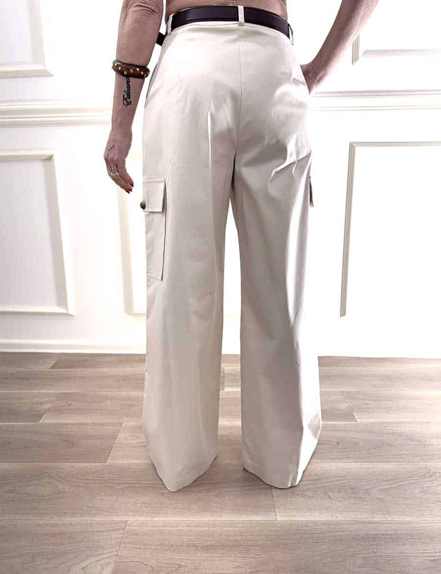 Pantalone cargo in cotone elasticizzato, zip e bottone sul davanti, pences e tasche laterali per un design rilassato. Tasconi laterali che richiamano lo stile Cargo.
