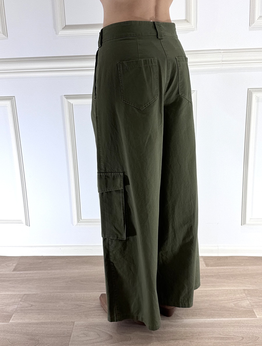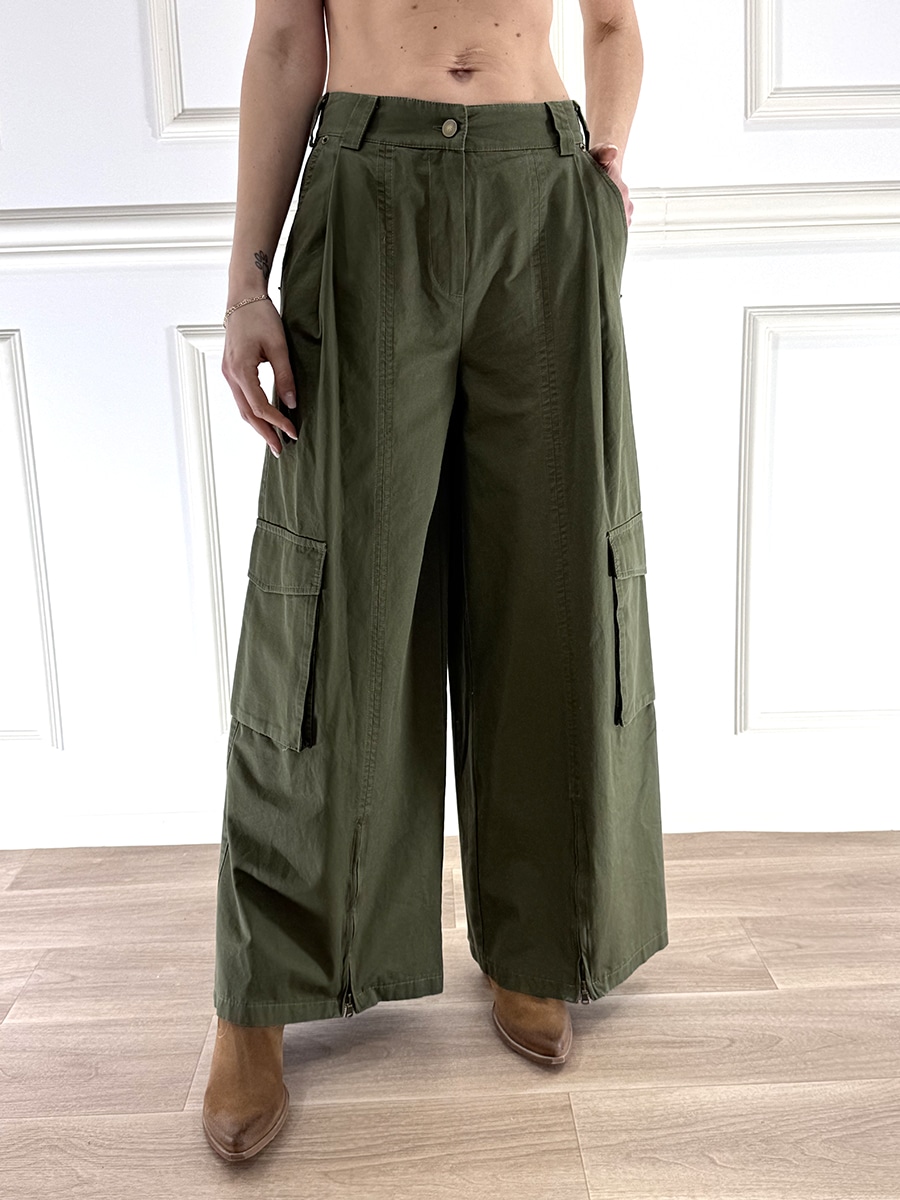 Pantalone cargo , vita regolare , zip e bottone per la chiusura, modello gamba larga, tasche laterali.