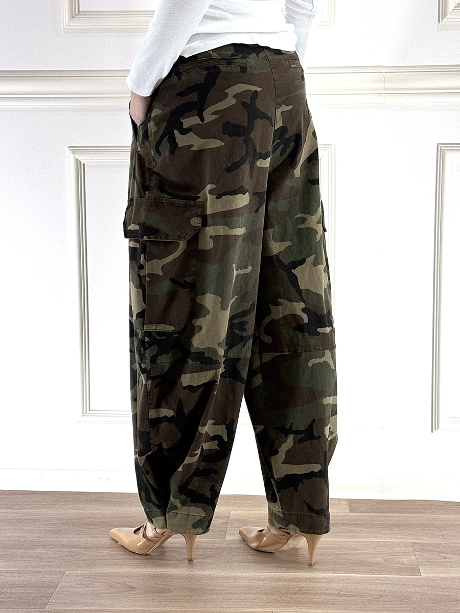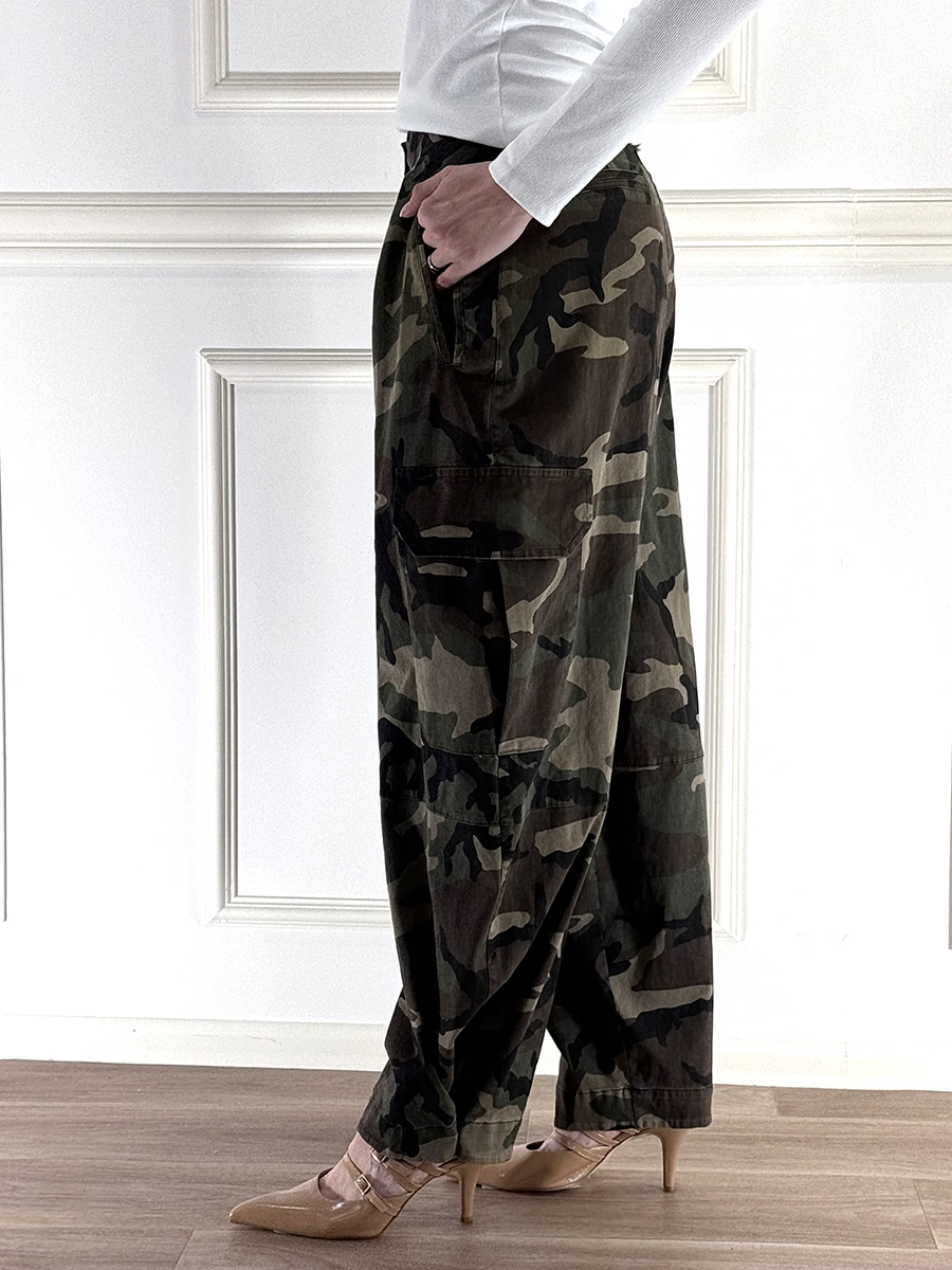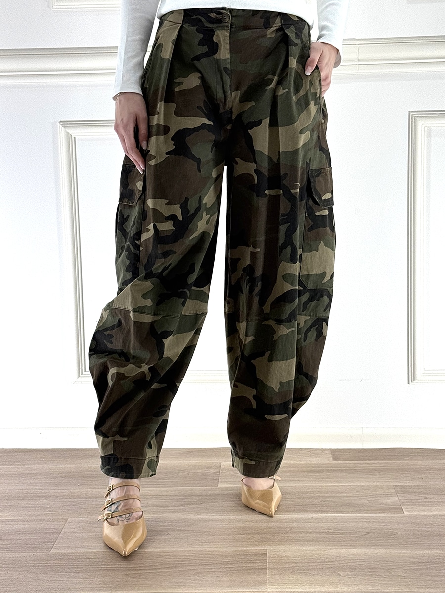 Pantalone cargo camouflage modello barrel, zip e bottone per la chiusura. Vita regolare, vestibilità regolare. Tasche laterali per un design rilassato e contemporaneo.