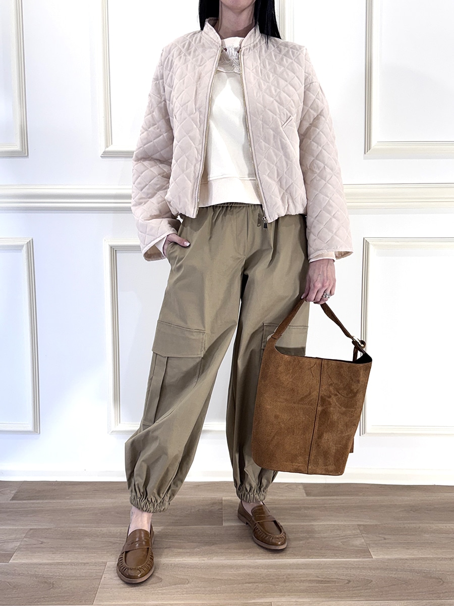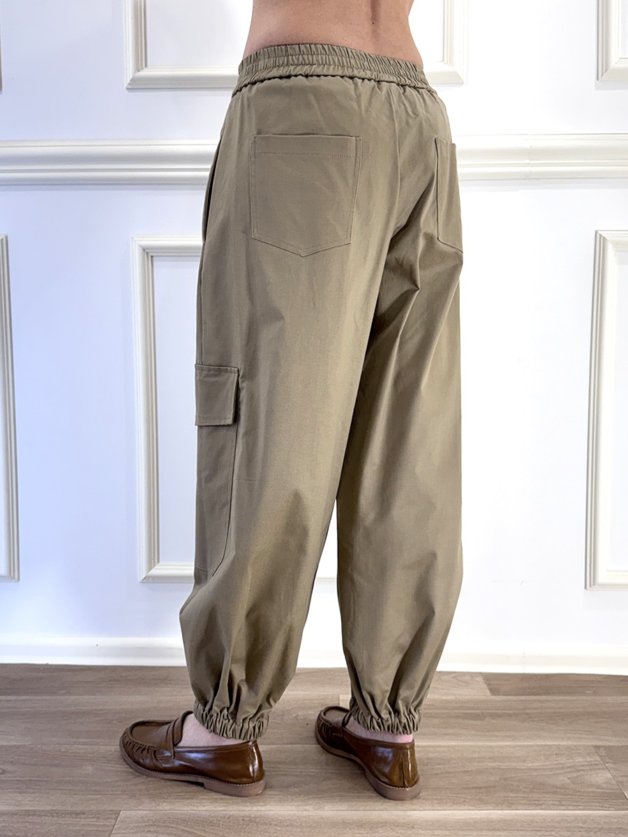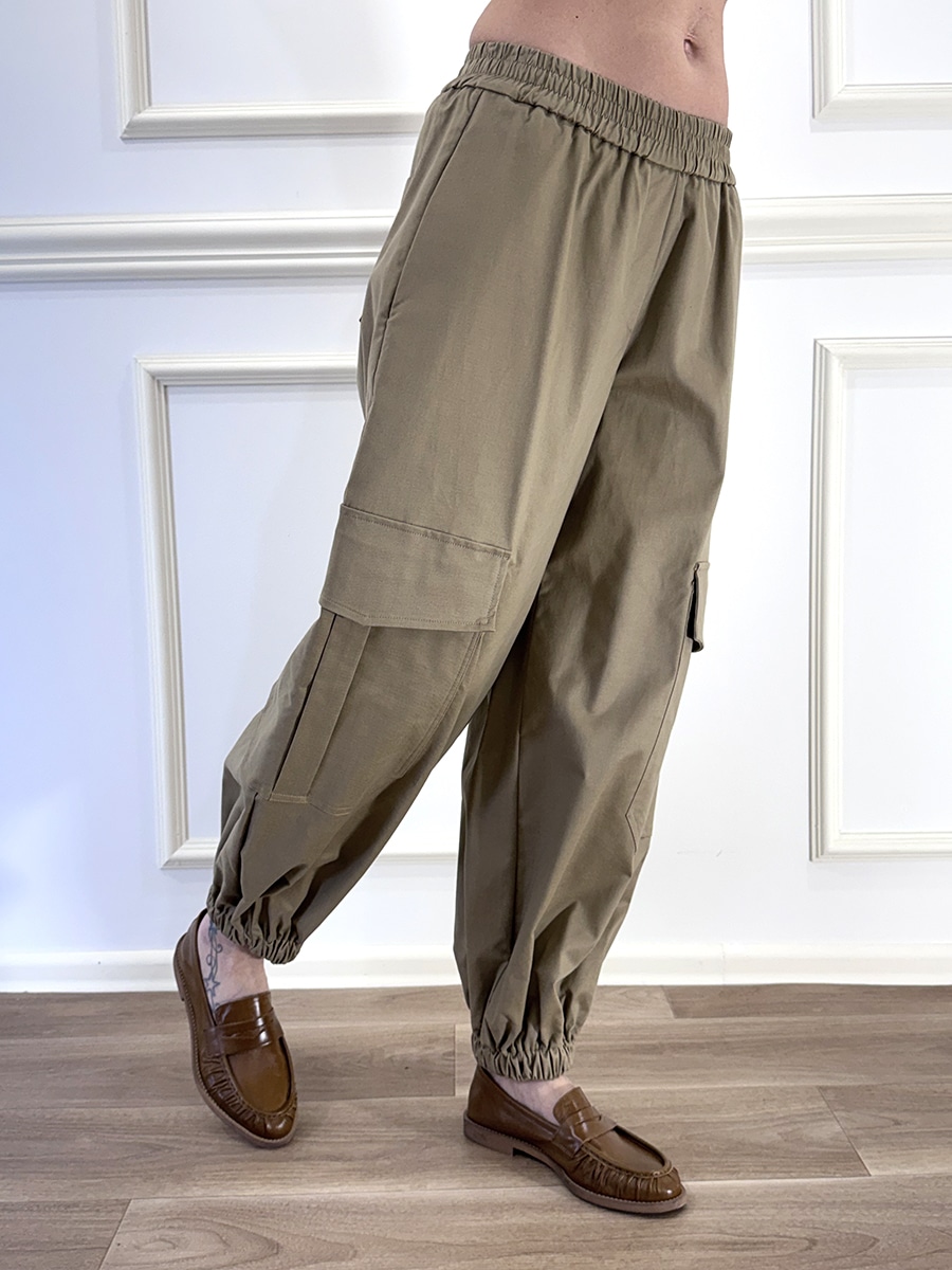 Pantalone cargo con elastico in vita per il massimo comfort. Design arricchito da tasconi ampi laterali e arricciatura alla caviglia.