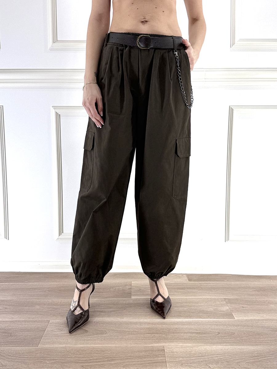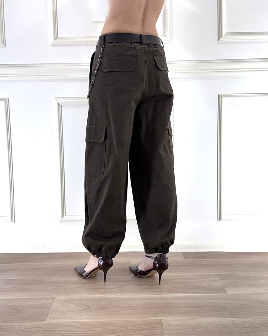 Pantalone cargo con elastico in vita e in fondo per il massimo comfort. Catena applicata removibile per un tocco urban.