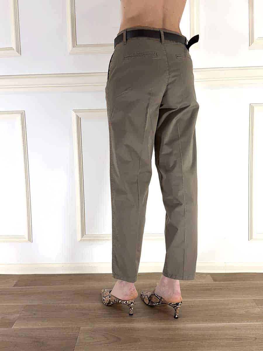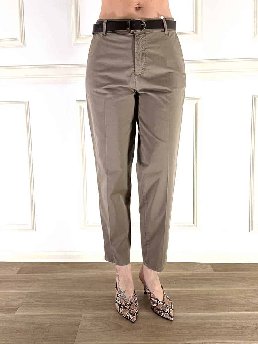 Pantalone in cotone elasticizzato, zip e bottone davanti per la chiusura, tasche alla francesi per un taglio pulito e semplice. Cintura in vita per delineare il punto vita.