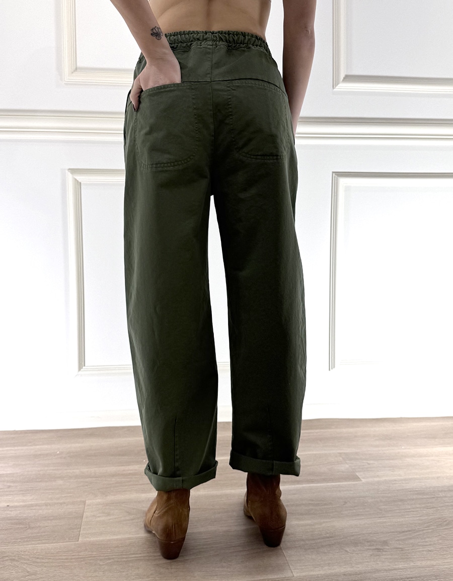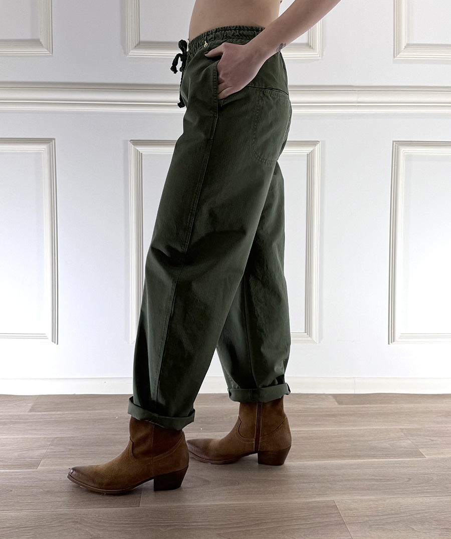 Pantalone con coulisse ed elastico in vita , vestibilità comoda, tasche laterali per un look rilassato, modello leggermente barrel.