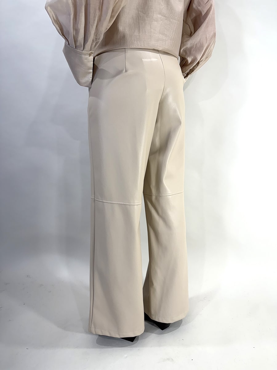 Pantalone modello gamba ampia realizzato in ecopelle color beige chiaro, dall’aspetto liscio e leggermente lucido.