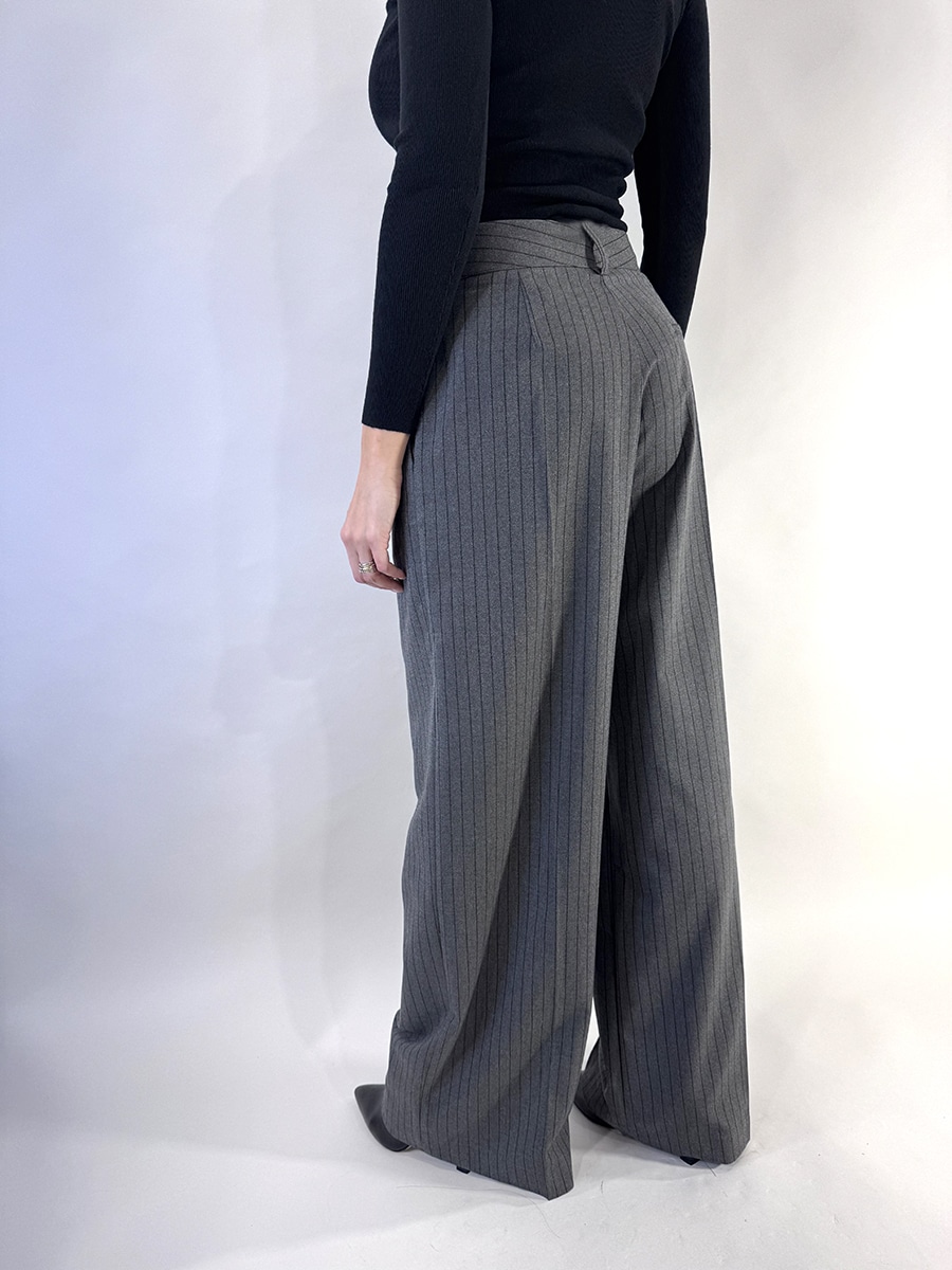 Pantalone a vita alta con gamba ampia e dritta, realizzato in tessuto grigio a righe sottili verticali.