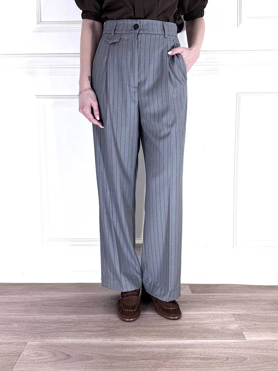 Pantalone gessato con pences sul davanti , design elegante e sartoriale, tasche laterali per un taglio rilassato, zip e bottone per la chiusura.