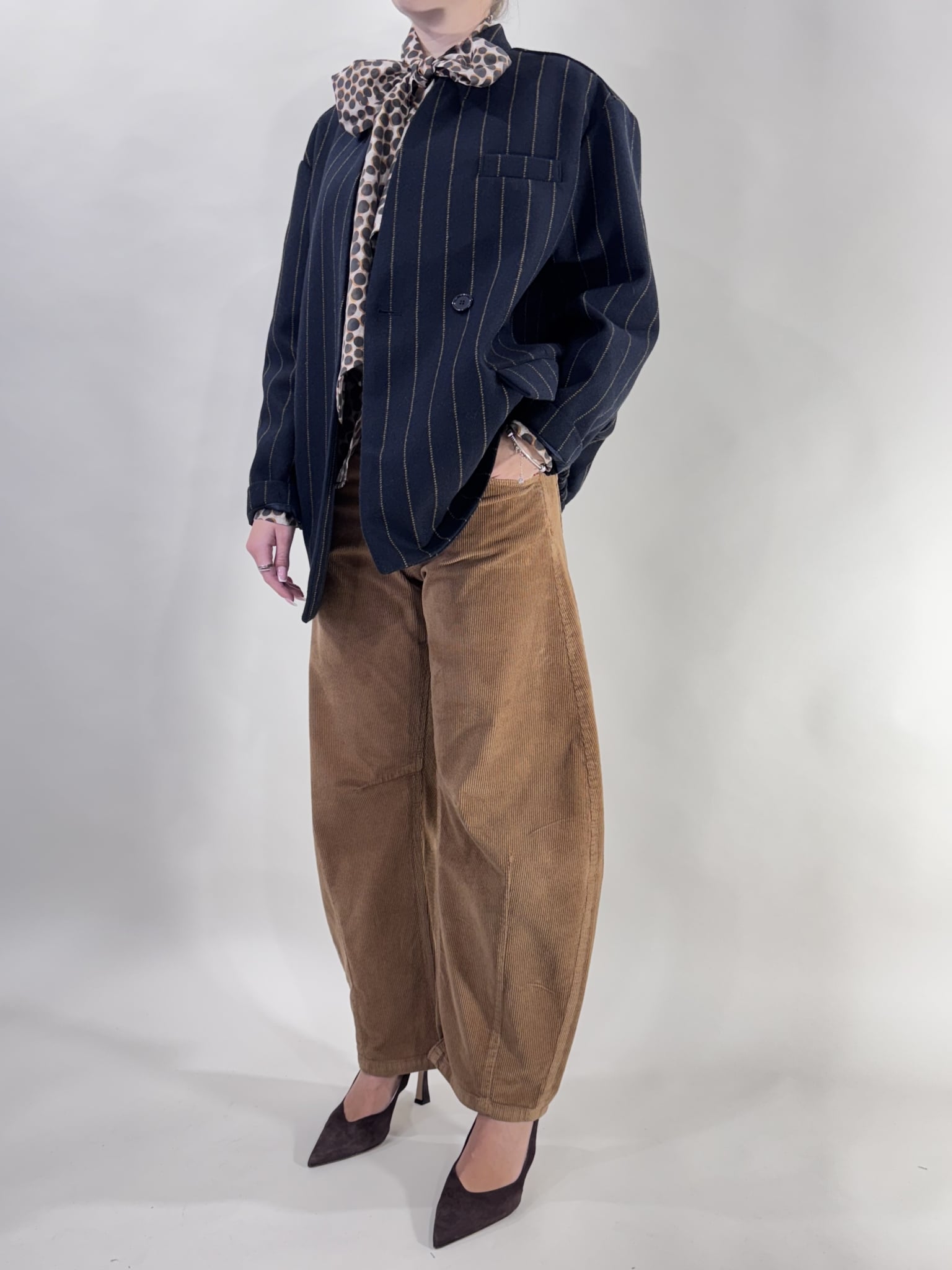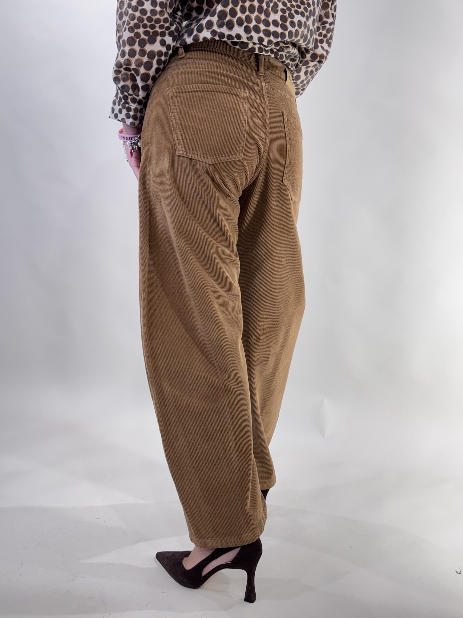 Pantalone in velluto a coste dal taglio ampio e linea morbida. Realizzato in cotone con vita regolare e tasche laterali, offre comfort e stile in ogni occasione. Il tessuto caldo e la texture a coste lo rendono perfetto per la stagione autunnale. Un capo chic ideale per look casual ma ricercati, da abbinare a camicie fluide o maglioni oversize.