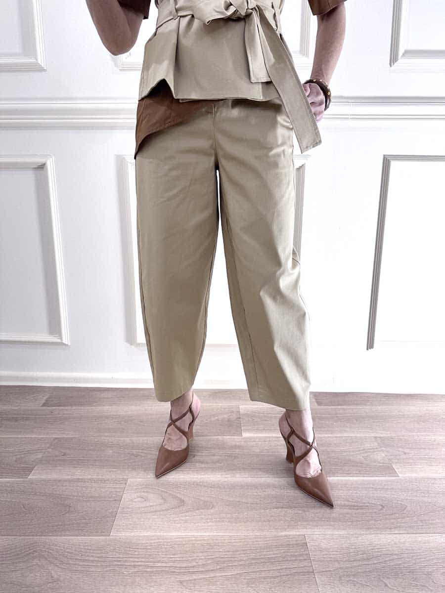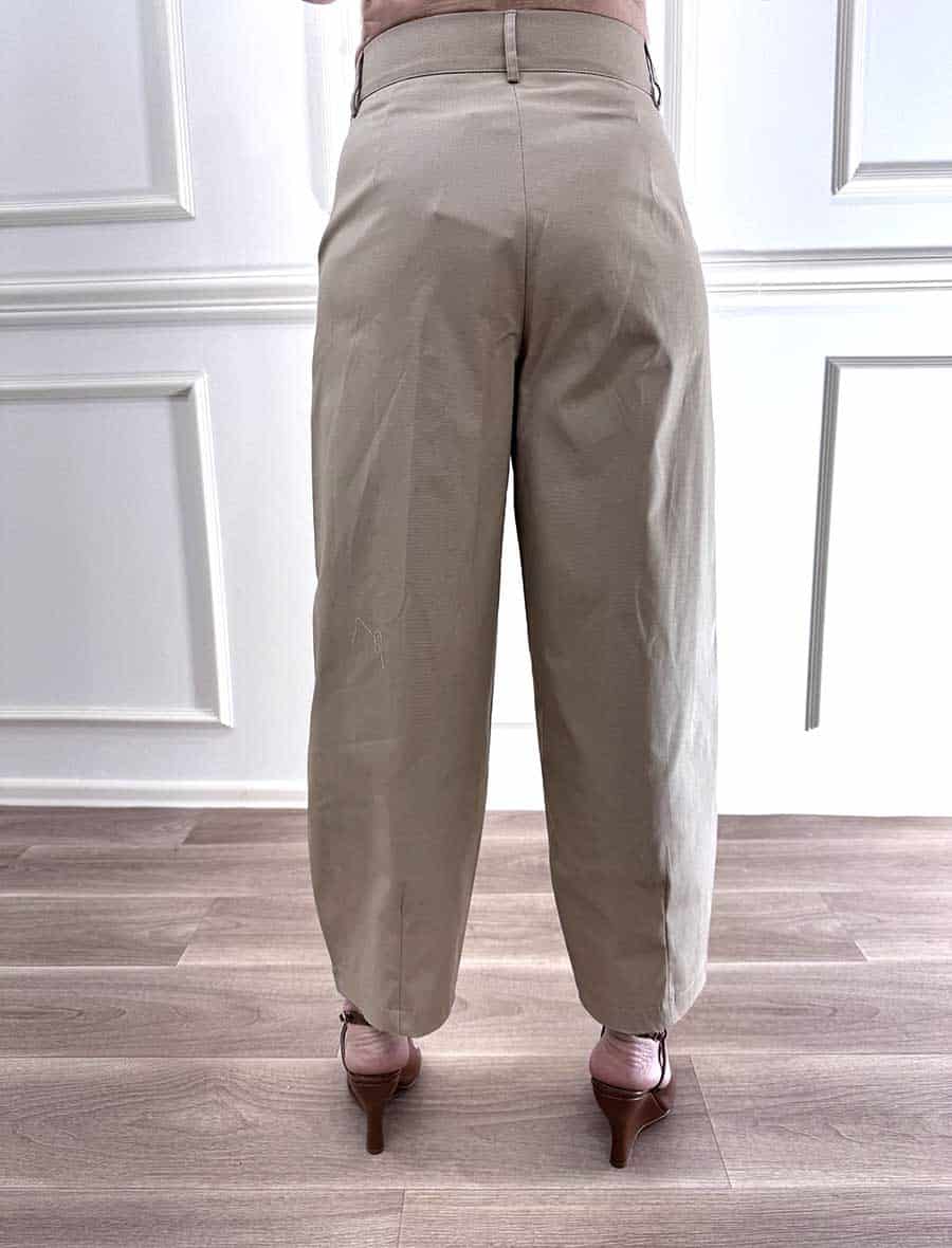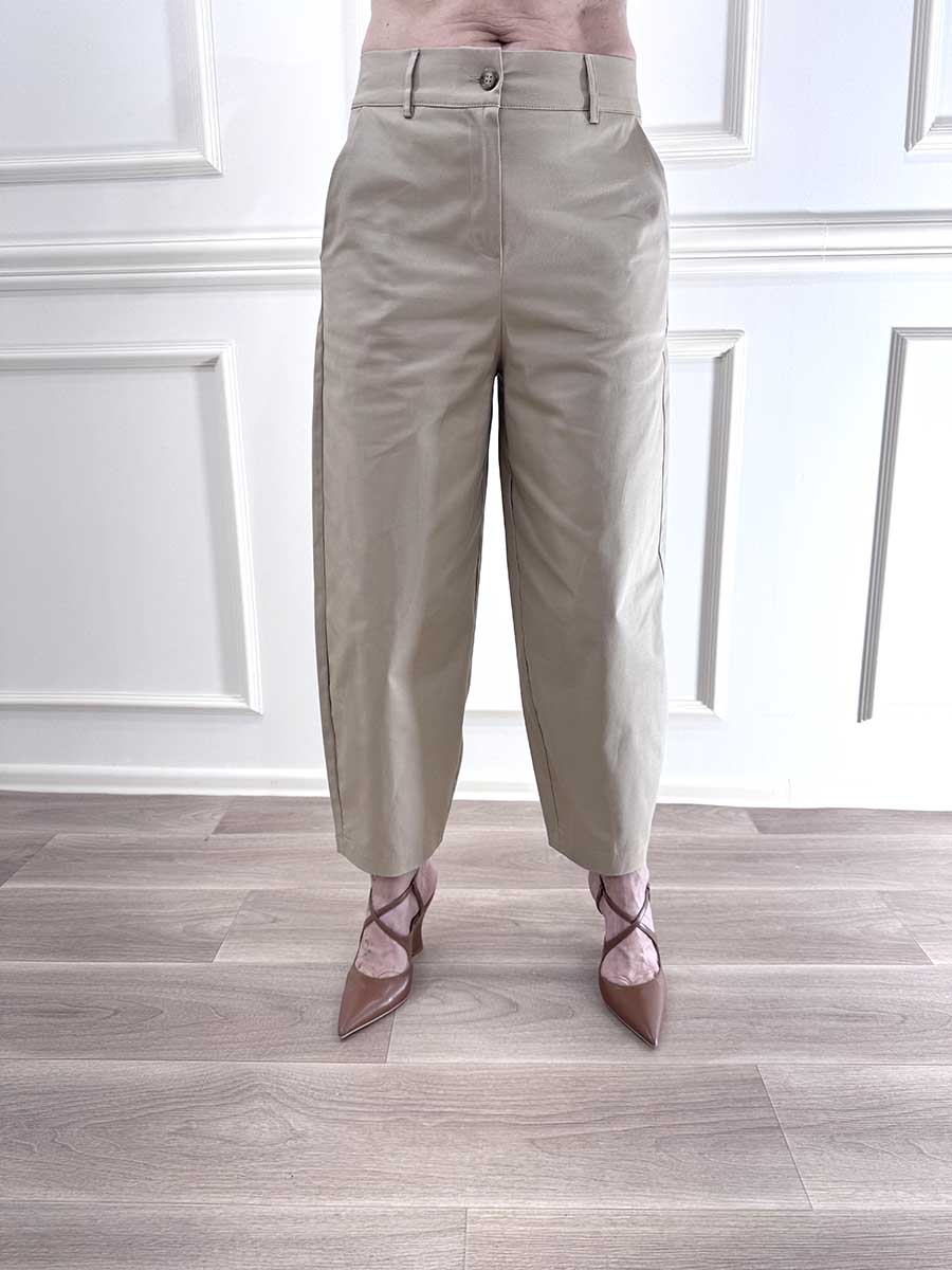Pantalone in cotone elasticizzato modello ovetto, zip e bottone davanti per la chiusura.