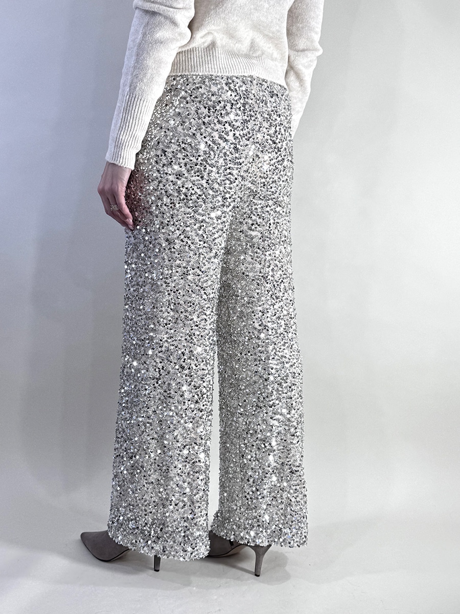 Pantalone in paillettes , gamba larga, elastico in vita , fodera interna.
