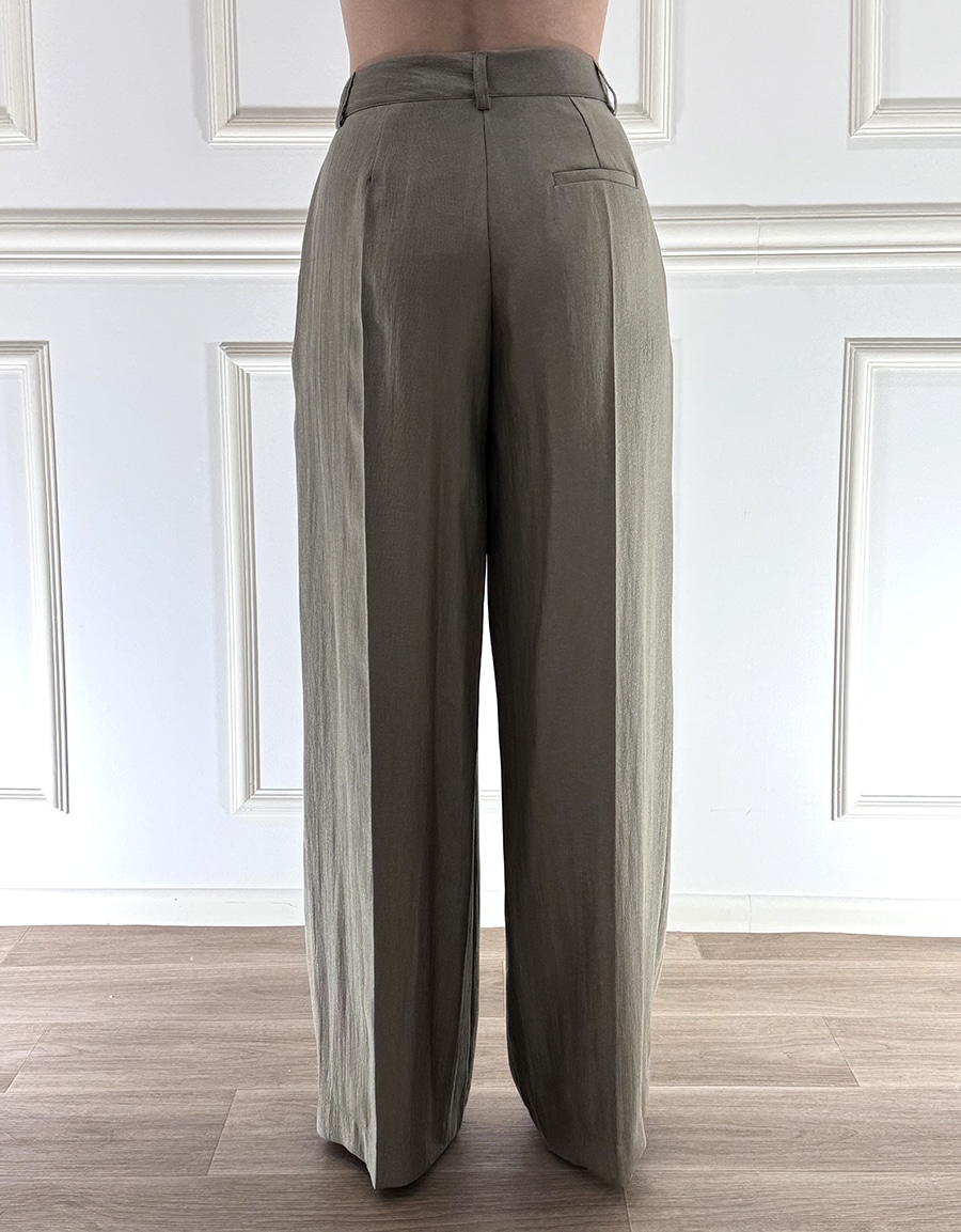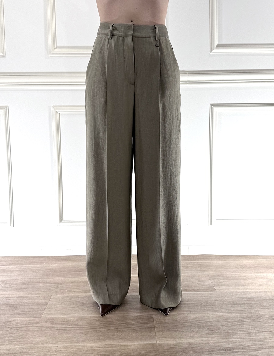Pantalone a palazzo , piega frontale , zip e bottone per la chiusura, tasche laterali per un design rilassato .
