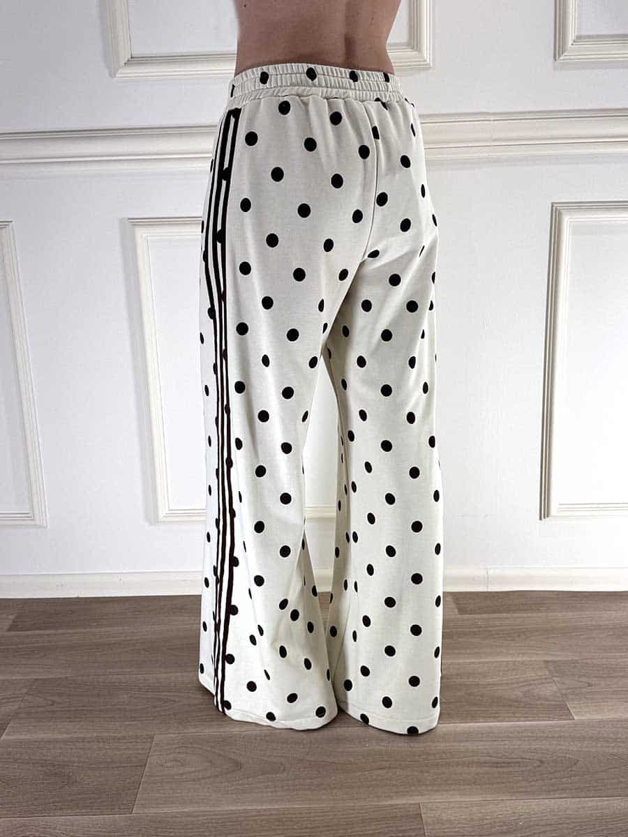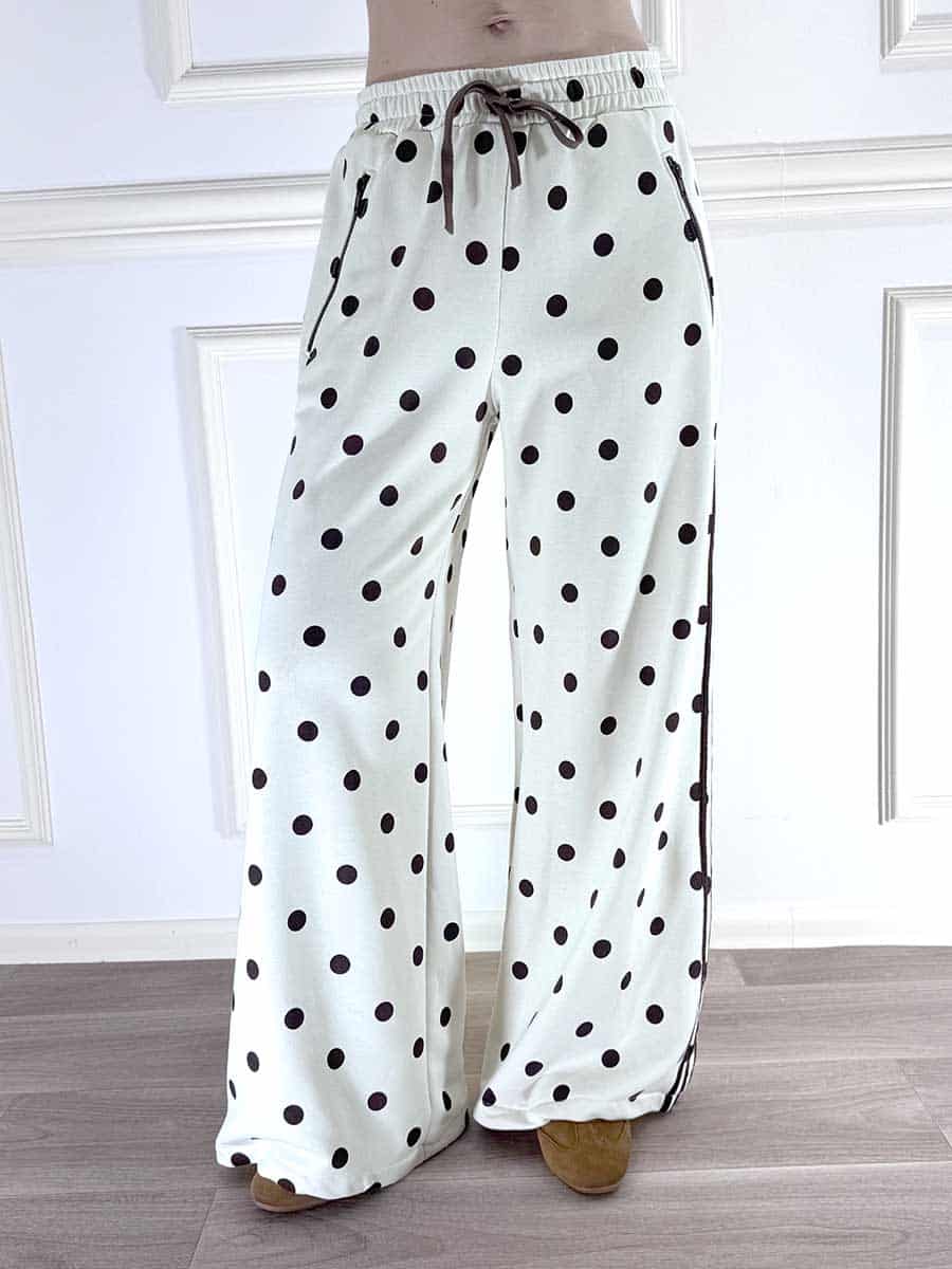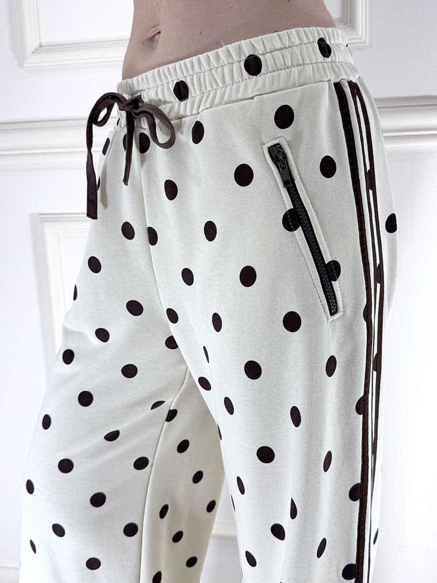 Pantalone di felpa in cotone a pois , base burro e pois moro, tasche con zip laterali per un look moderno. Bande laterali in contrasto.
