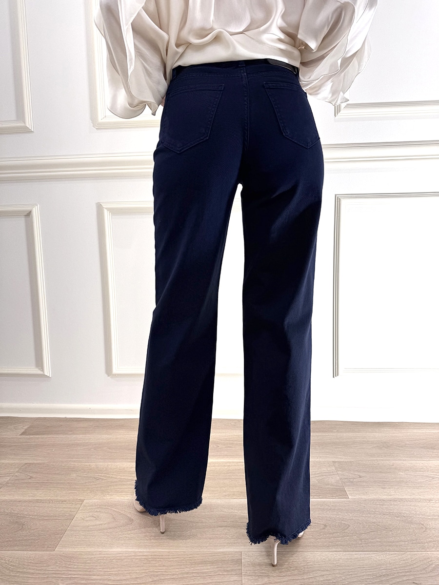 Pantalone elasticizzato sfrangiato in fondo, modello 5 tasche , zip e bottone davanti per la chiusura.