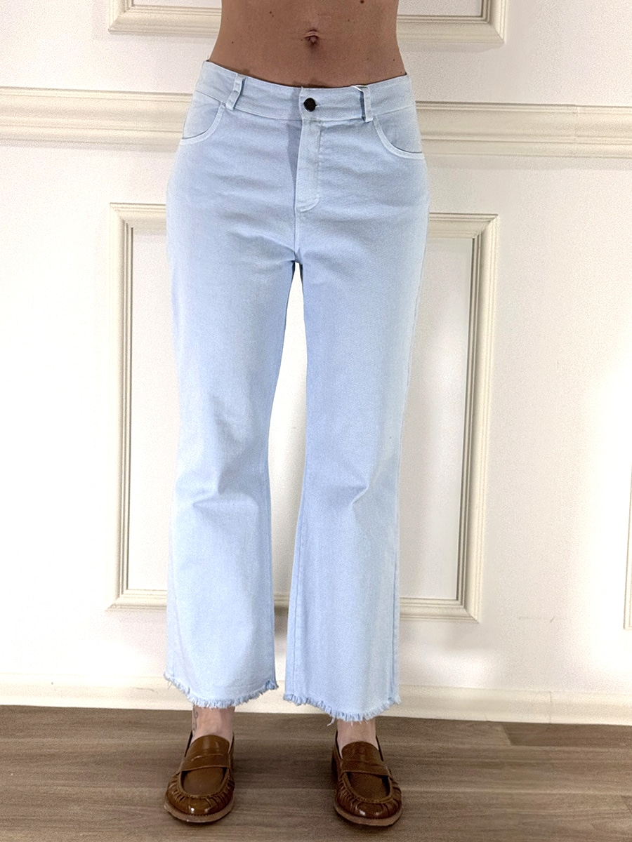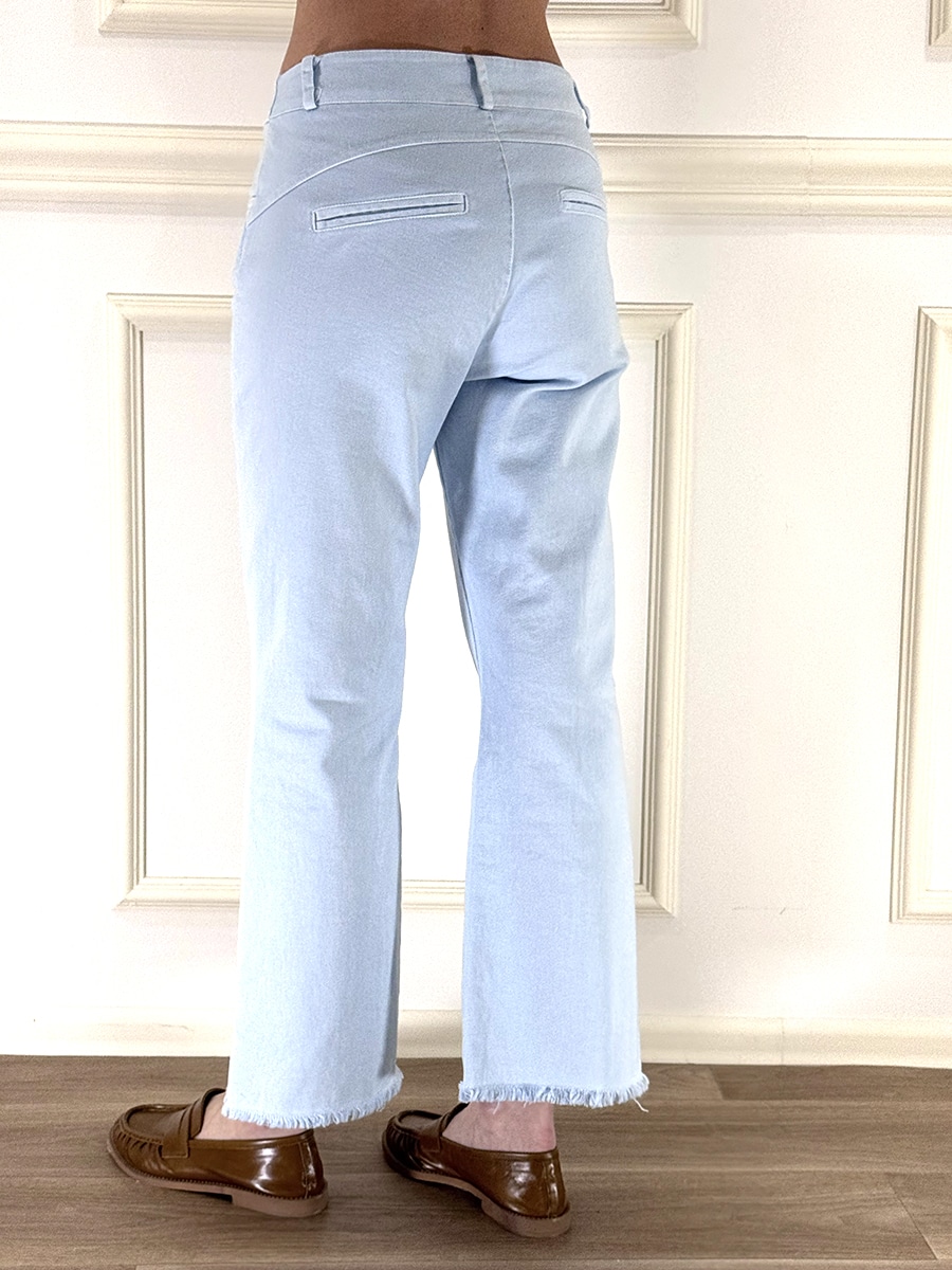 Pantalone in cotone sfrangiato elasticizzato , zip e bottone , passanti per la cintura.