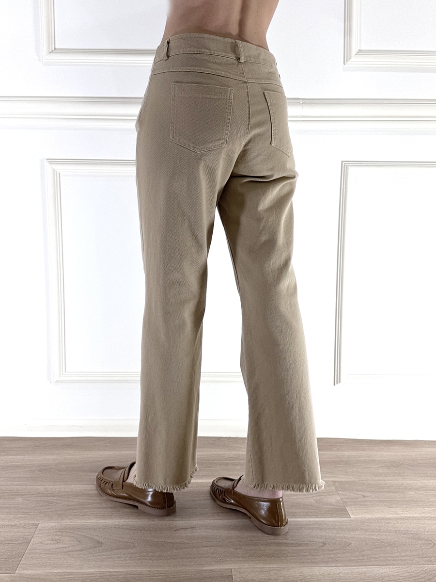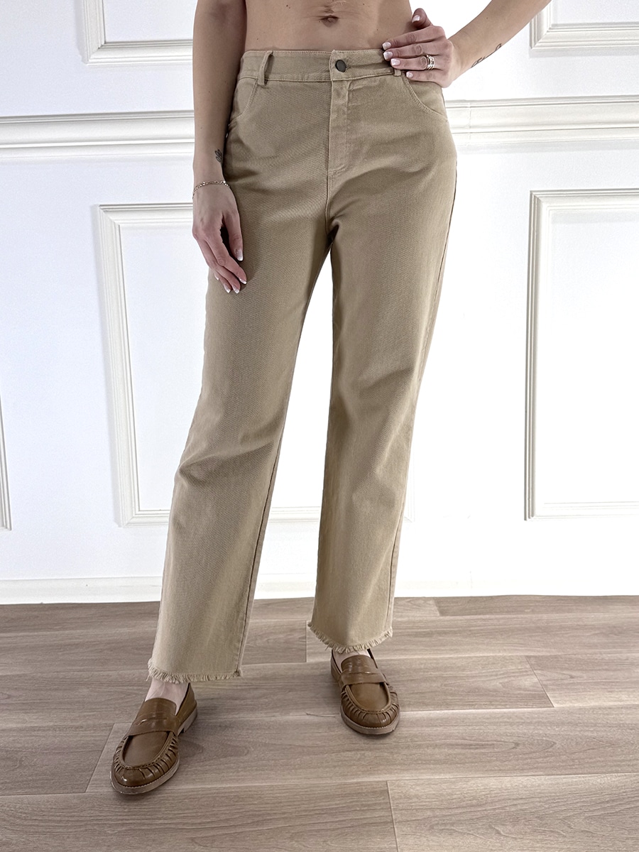 Pantalone sfrangiato slim straight ,chiusura con zip e bottone , vita regolare, leggermente elasticizzato.