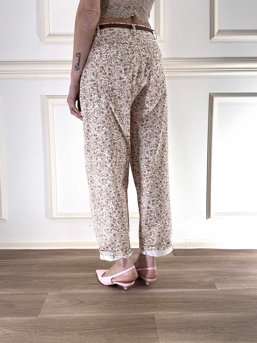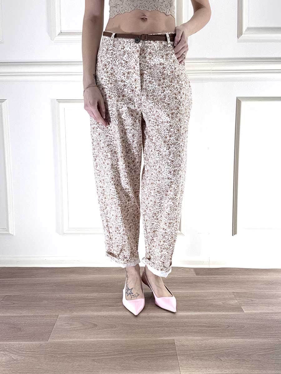 pantalone ad ovetto , stampa fiori , zip e bottone per la chiusura, vita regolare con cintura.
