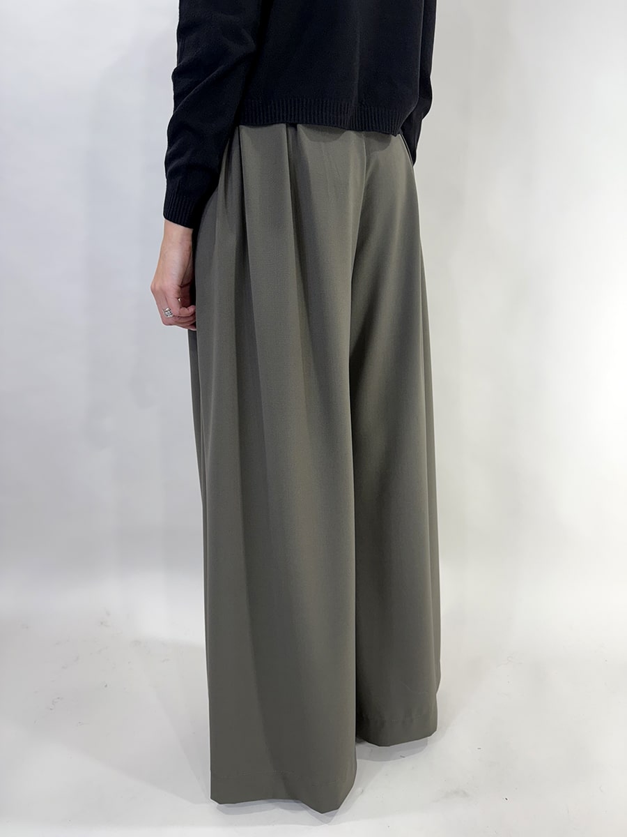 Pantalone a palazzo con gamba larga ampia e fluida , realizzato in tessuto liscio strutturato di colroe verde oliva. Vita alta con ampie pieghe davanti.