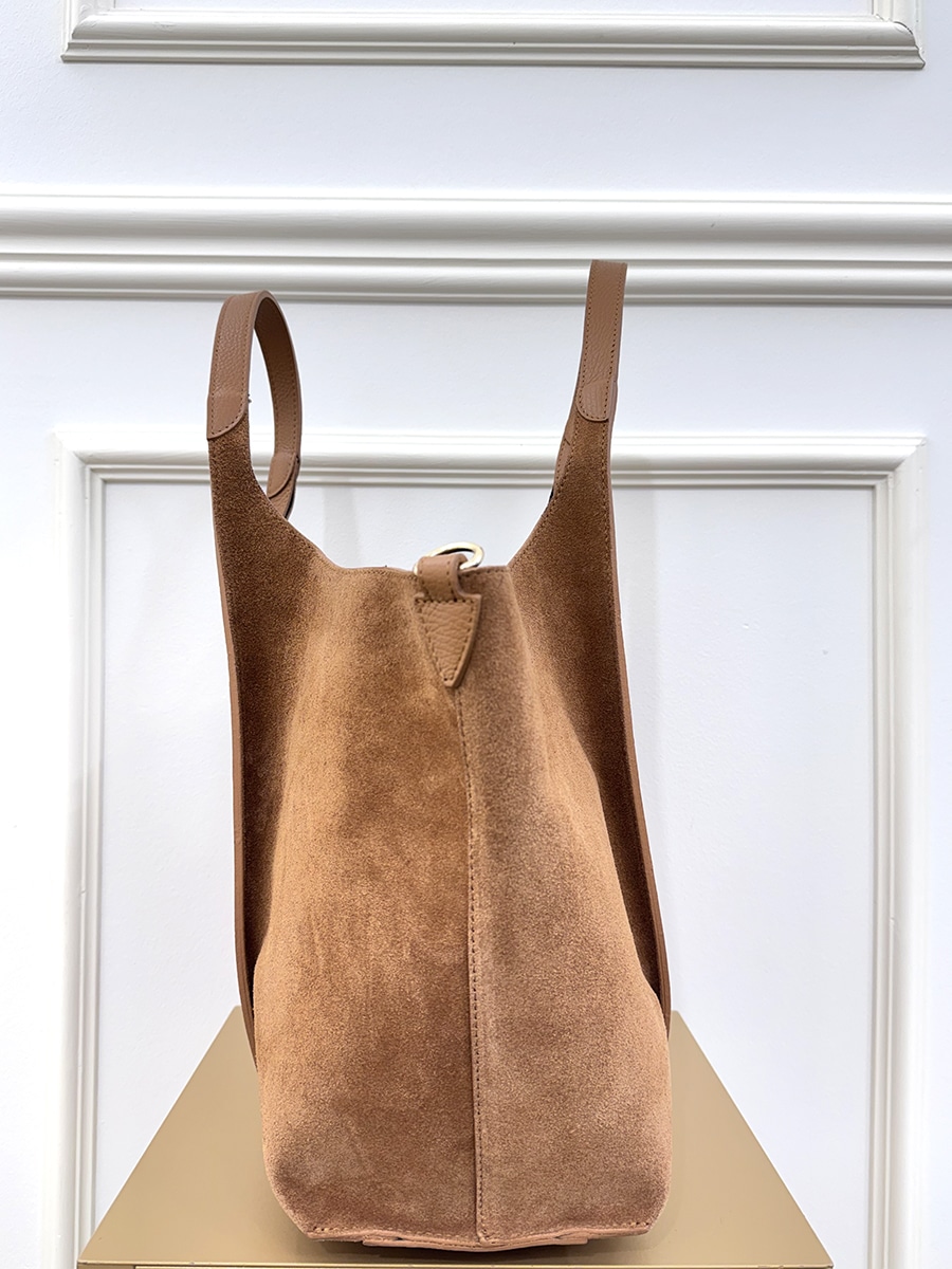 Shopper in pelle e suede color cuoio, con manici lunghi e bustina interna, per una maggiore capienza e praticità. tracolla in dotazione e chiusura con patta e gancio metallico. Design contemporaneo e capiente.