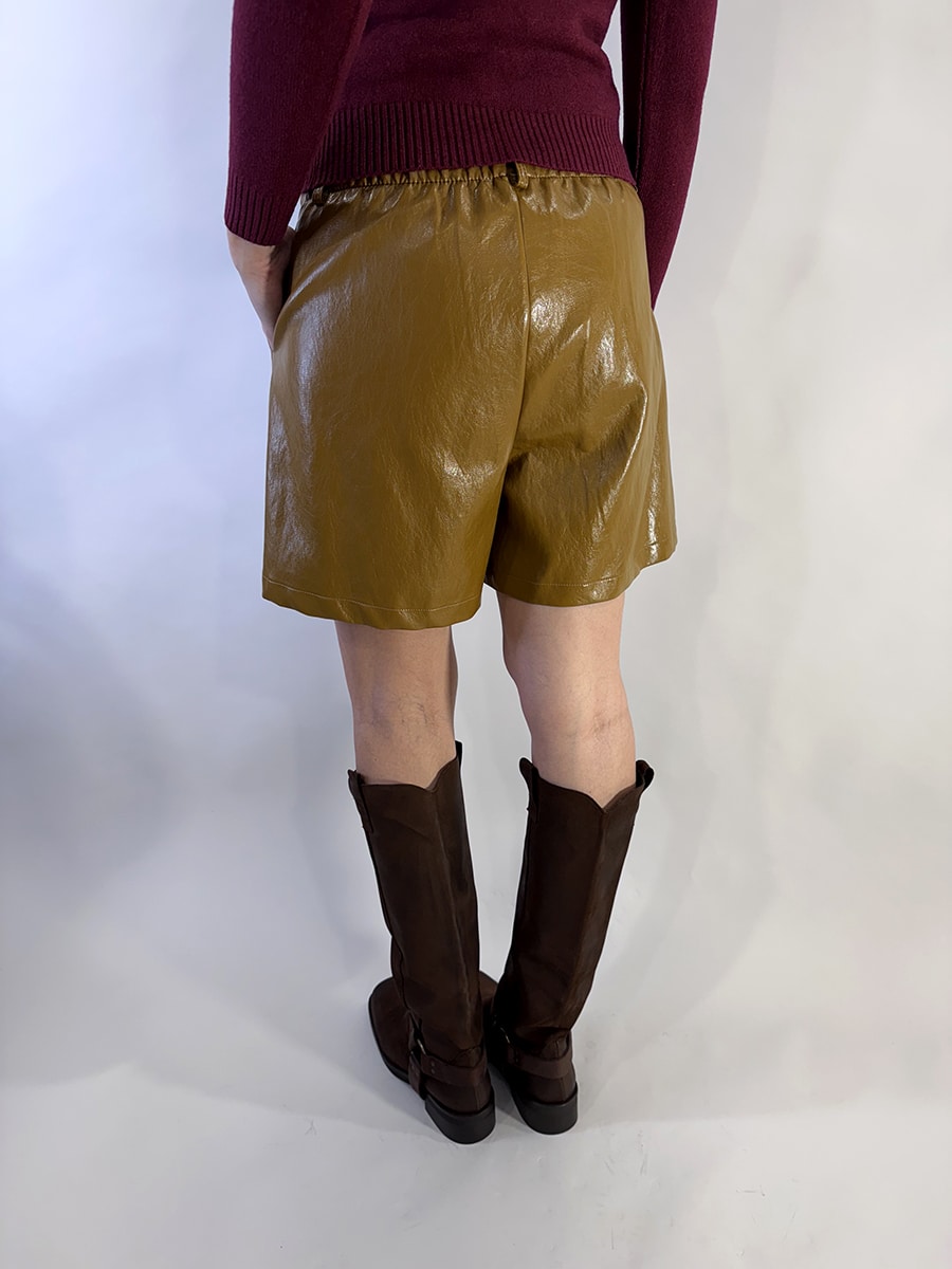 Bermuda in ecopelle con zip e bottone per la chiusura.Linea morbida leggermente svasata che dona comodità e movimento. Design pulito e minimal.