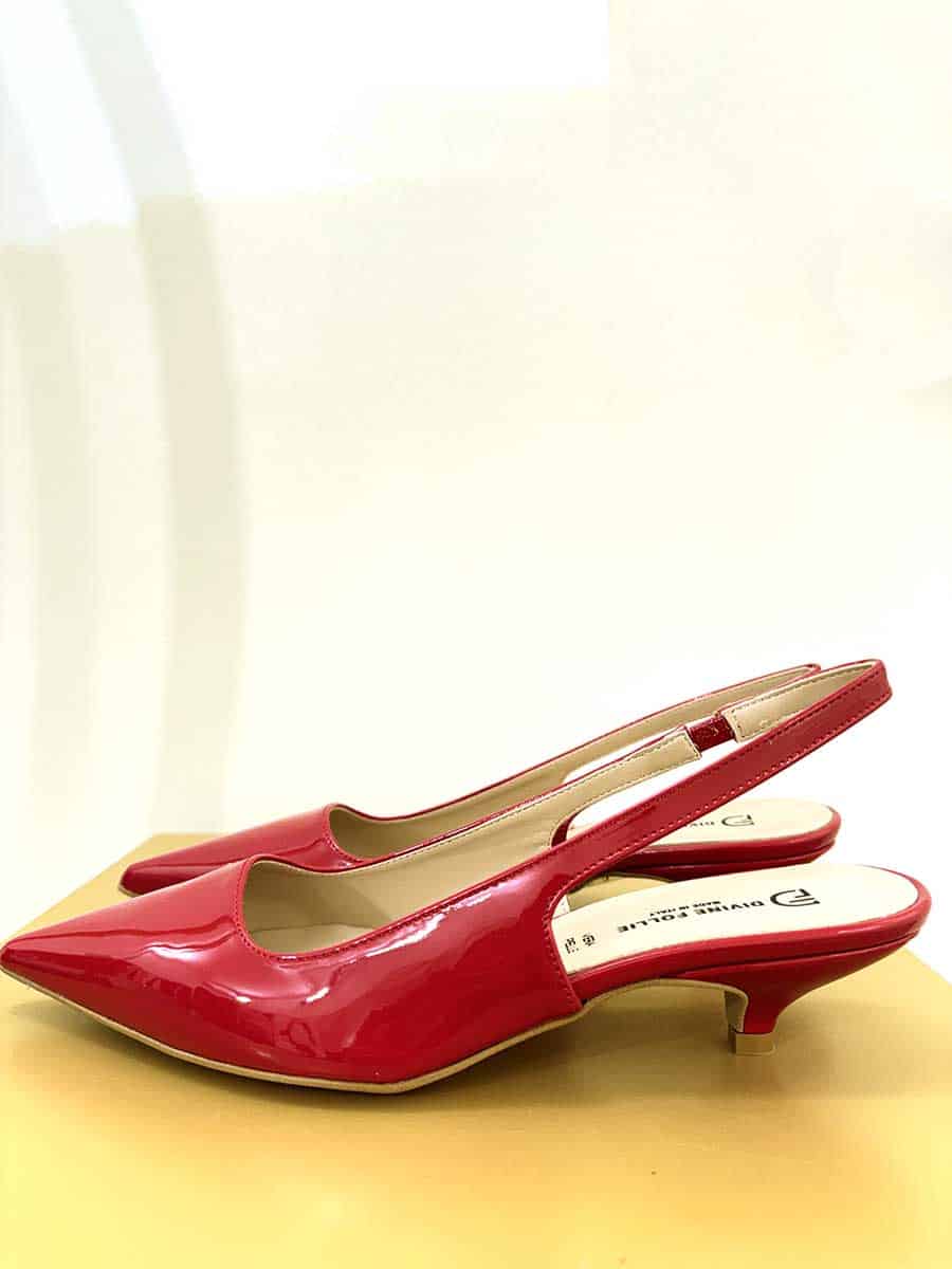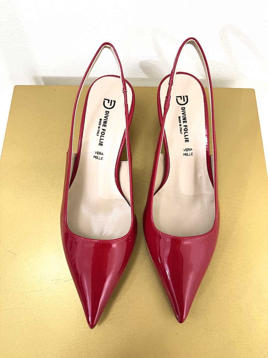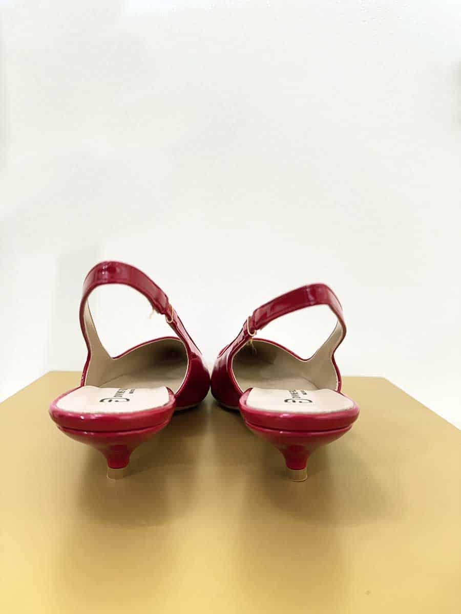 Slingback in vernice , cinturino con elastico , modello a punta, colore rosso.
