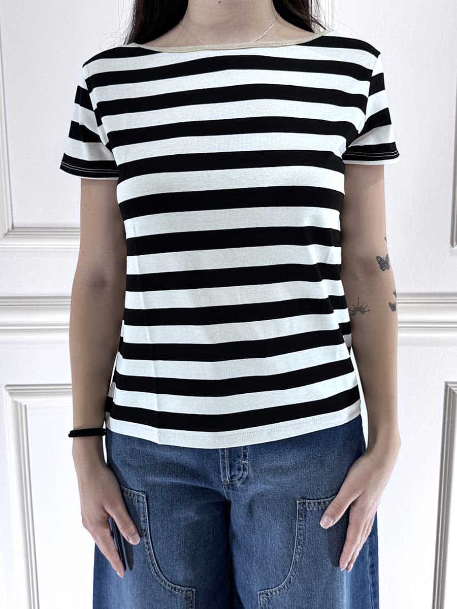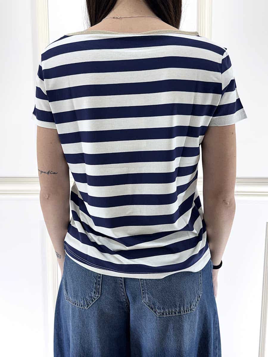 T-shirt a righe profilo color oro nel colletto vestibilità comoda, tessuto elasticizzato.