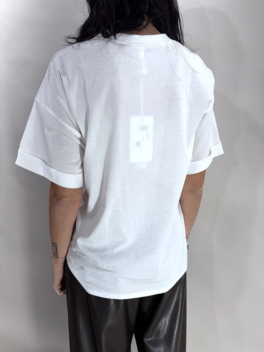 T-shirt in cotone bianco con stampa artistica frontale multicolor e scritta “opulence”. Vestibilità morbida e taglio classico per un look casual e di tendenza.
