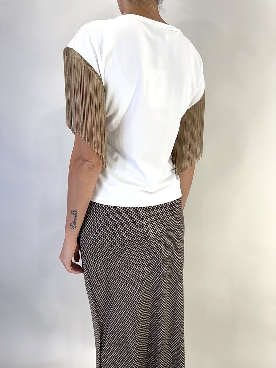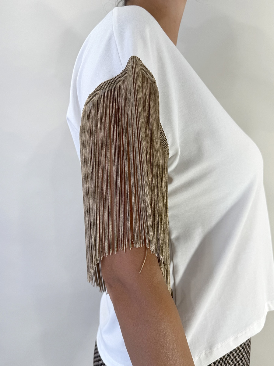 T-shirt colore bianco impreziosita da frange color oro. Perfetta per completare con  stile i vostri look senza passare inosservate.
