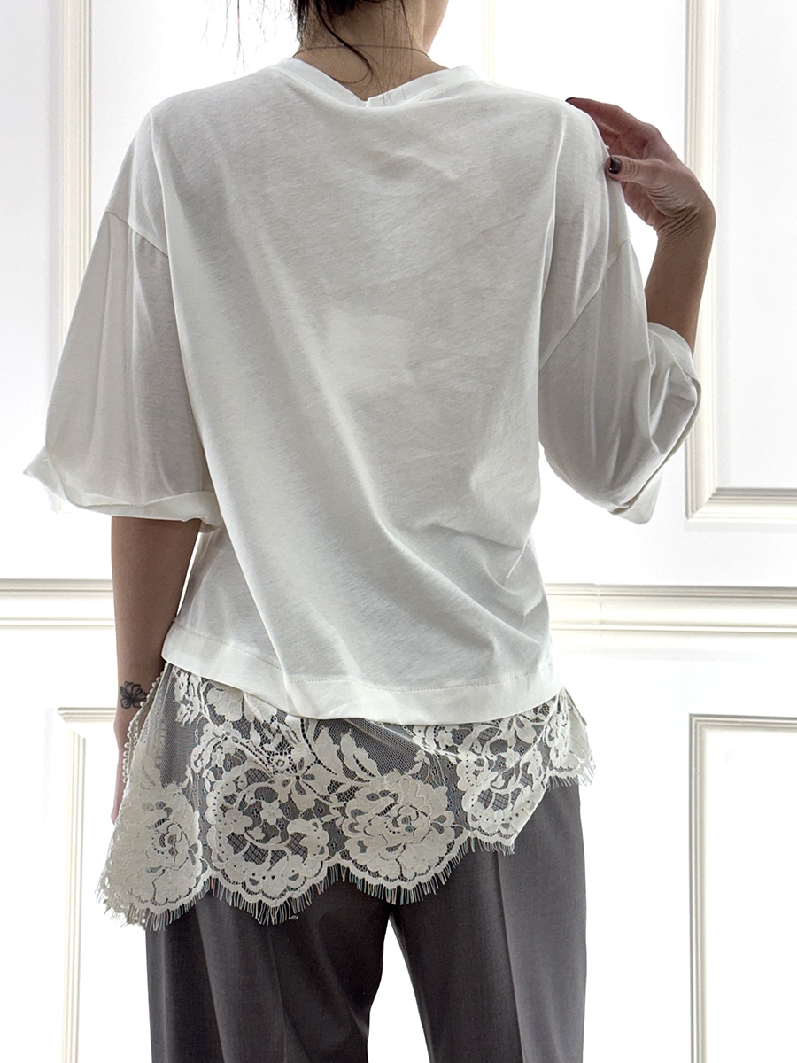 T-shirt in cotone modello girocollo mezza mancia, vestibilità comoda, pizzo in fondo asimmetrico con spacco laterale.