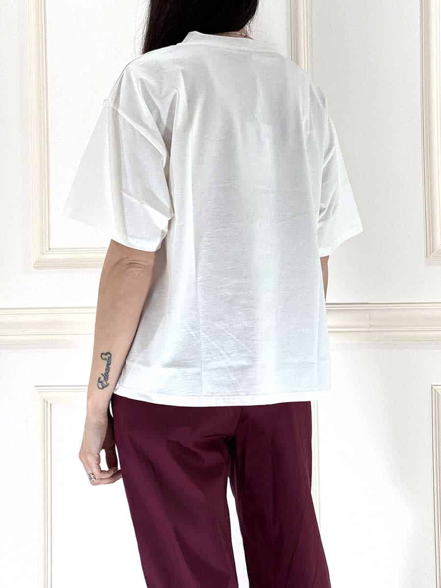 T-shirt in cotone , vestibilità comoda, scritta in contrasto colore nero ” meno male che c’è il mare ” .