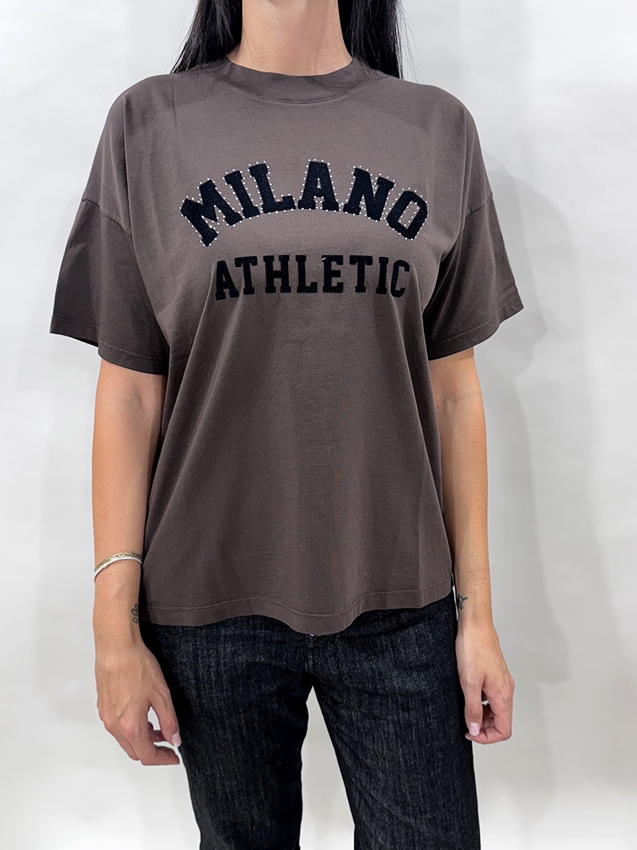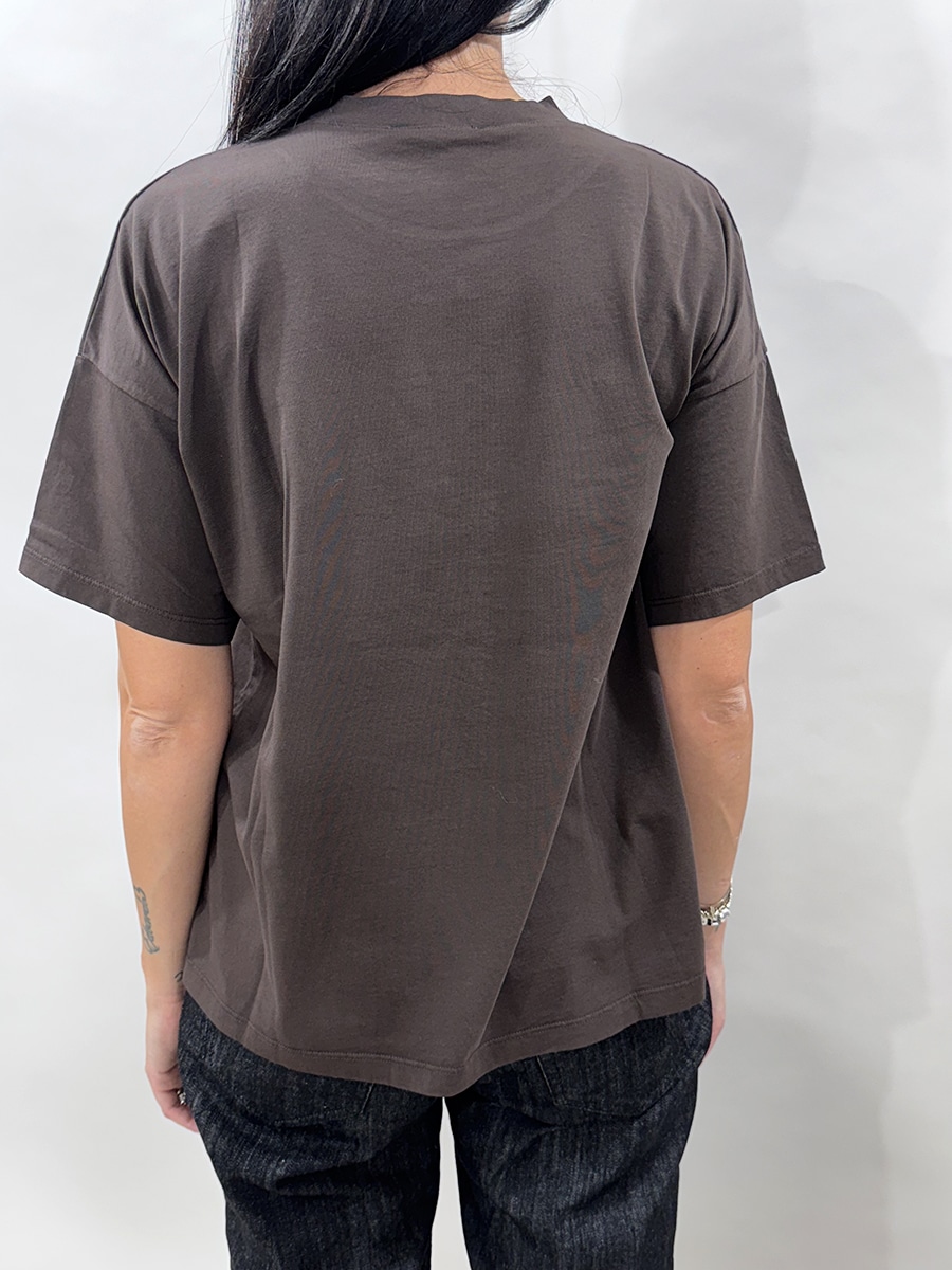 T-shirt girocollo modello over colore moro con stampa e borchie , fit non asciutto.