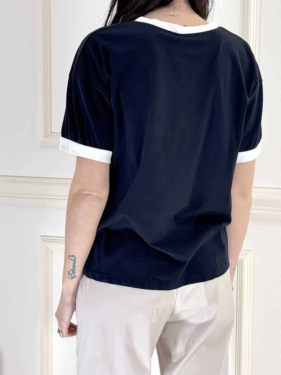 T-shirt girocollo , giromanica , vestibilità comoda, colore blu/panna, stampa n 5 davanti , profili in contrasto.