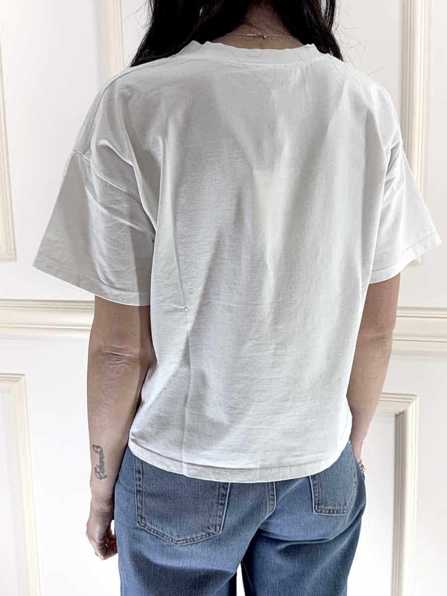 T-Shirt Girocollo Scatoletta Maniche Corte. Colore bianco, vestibilità comoda. Capo versatile. tg unica