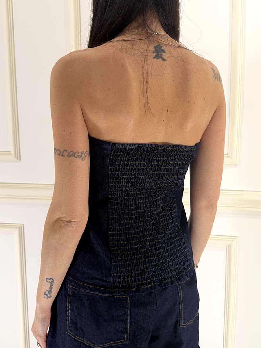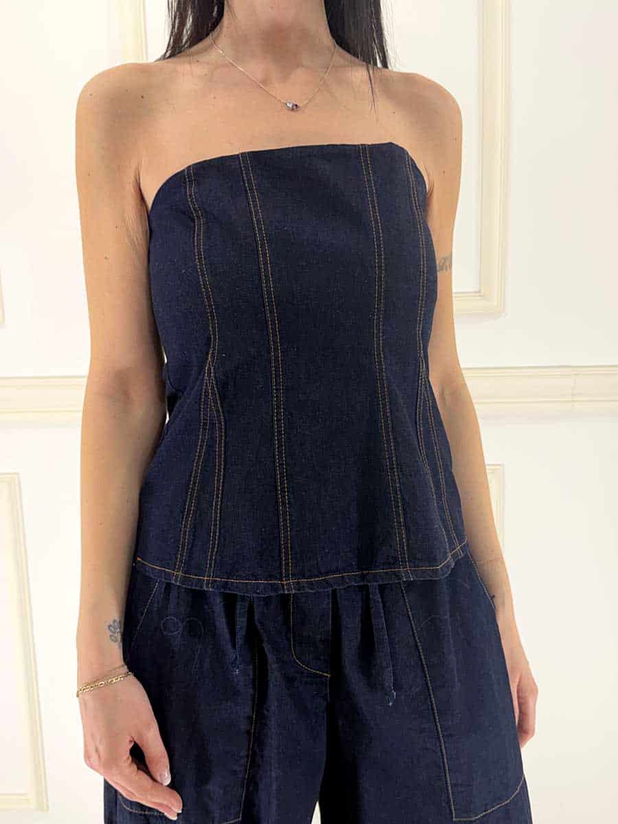 Top a fascia in denim blu scuro, elastico nel retro del busto per il massimo comfort e zip laterale per la chiusura per un taglio pulito e minimal,cuciture in contrasto.