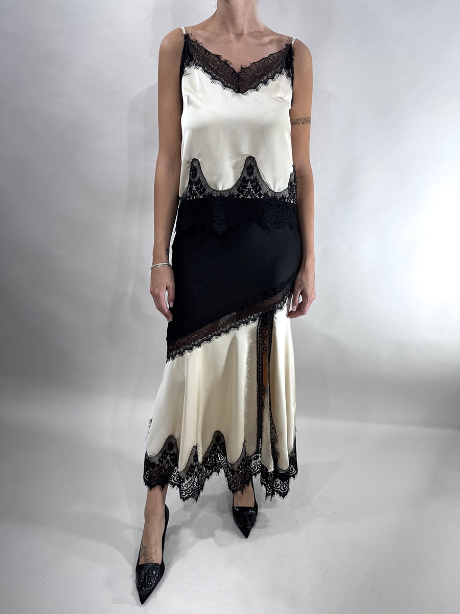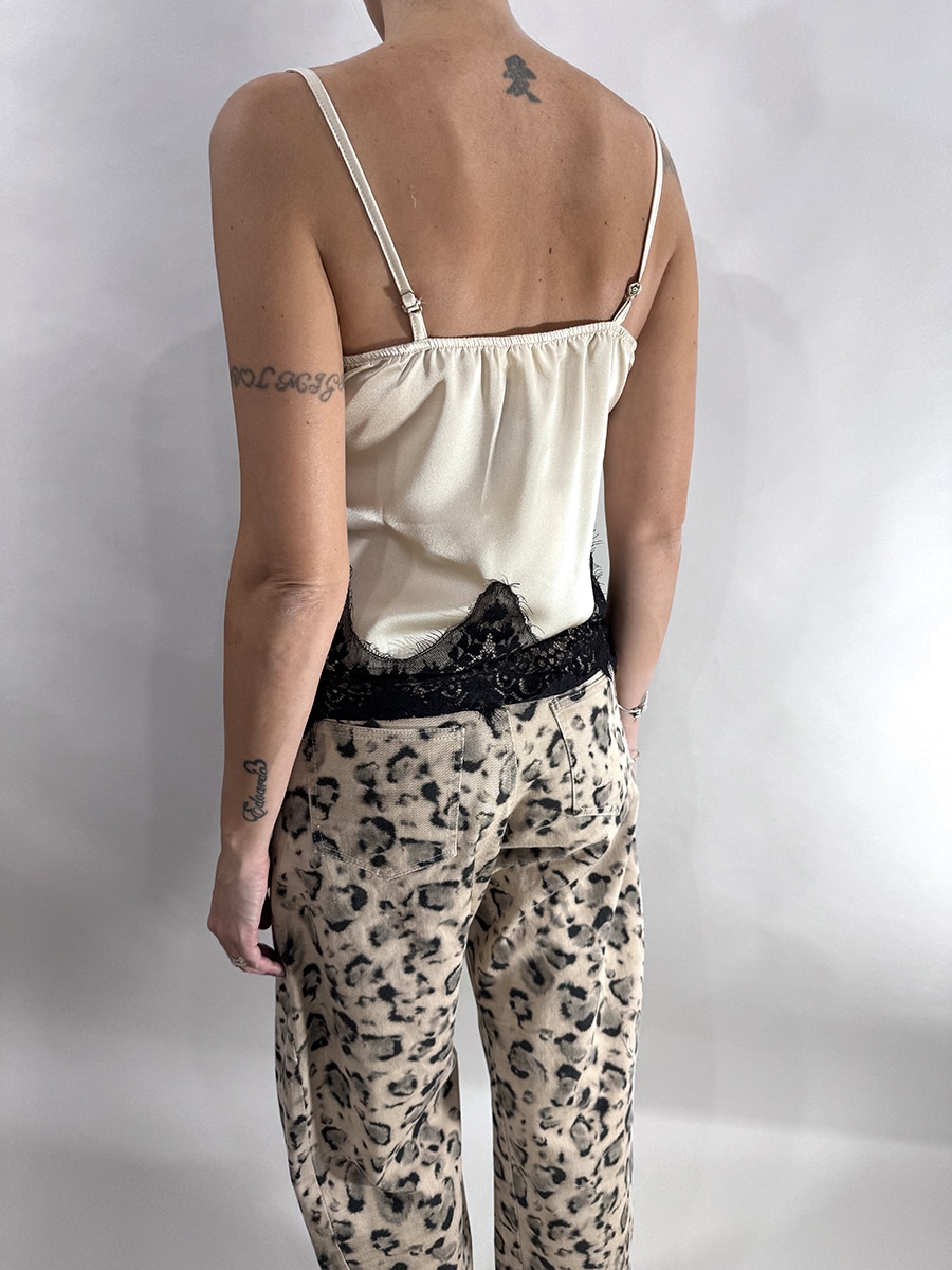Top in raso con scollatura a V e spalline sottili regolabili. Rifinito con inserti in pizzo nero sul decolletè e lungo l’orlo, che aggiungono un tocco raffinato e sensuale. Disponibile nelle varianti beige e moro.