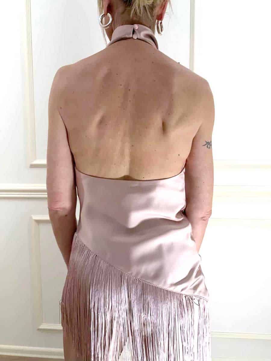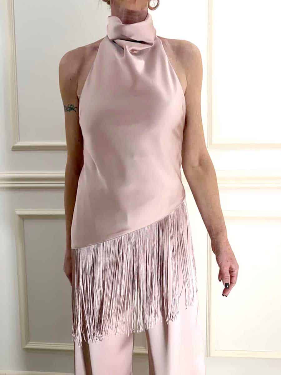 Top asimmetrico valorizzato da un fondo decorato con frange in movimento. Il design con scollo halter incornicia la linea delle spalle, risultando ideale per comporre look distintivi e contemporanei. Scelta raffinata per chi ricerca una proposta versatile e dal carattere deciso, da abbinare a pantaloni sartoriali o gonne essenziali.
