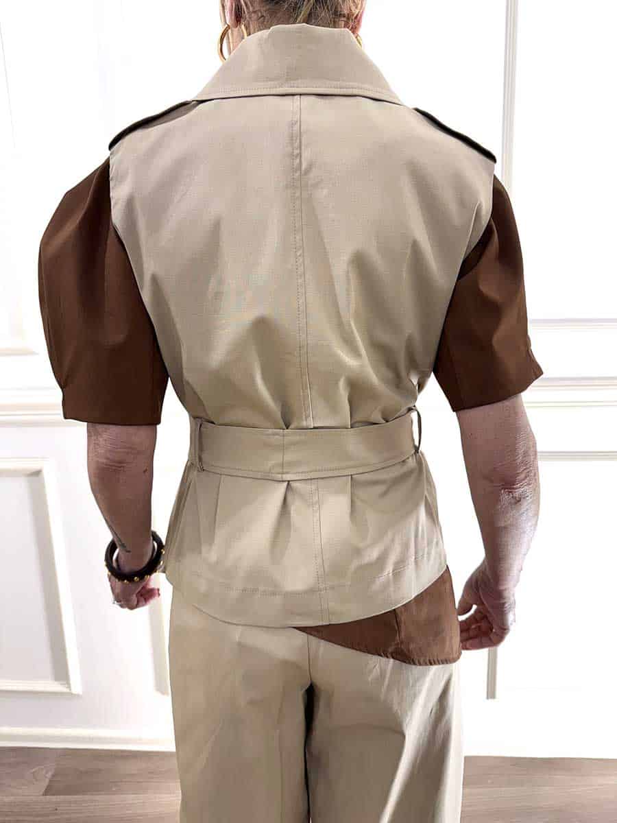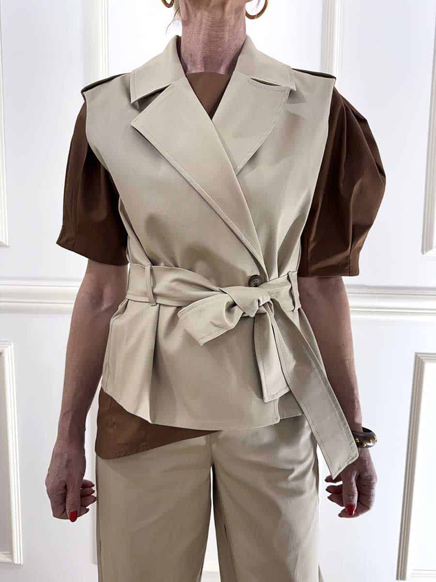 Trench smanicato modello doppiopetto con cintura, possibilità di cinturarlo in vita per delineare e slanciare la figura, perfetto sia come capospalla che come gilet.