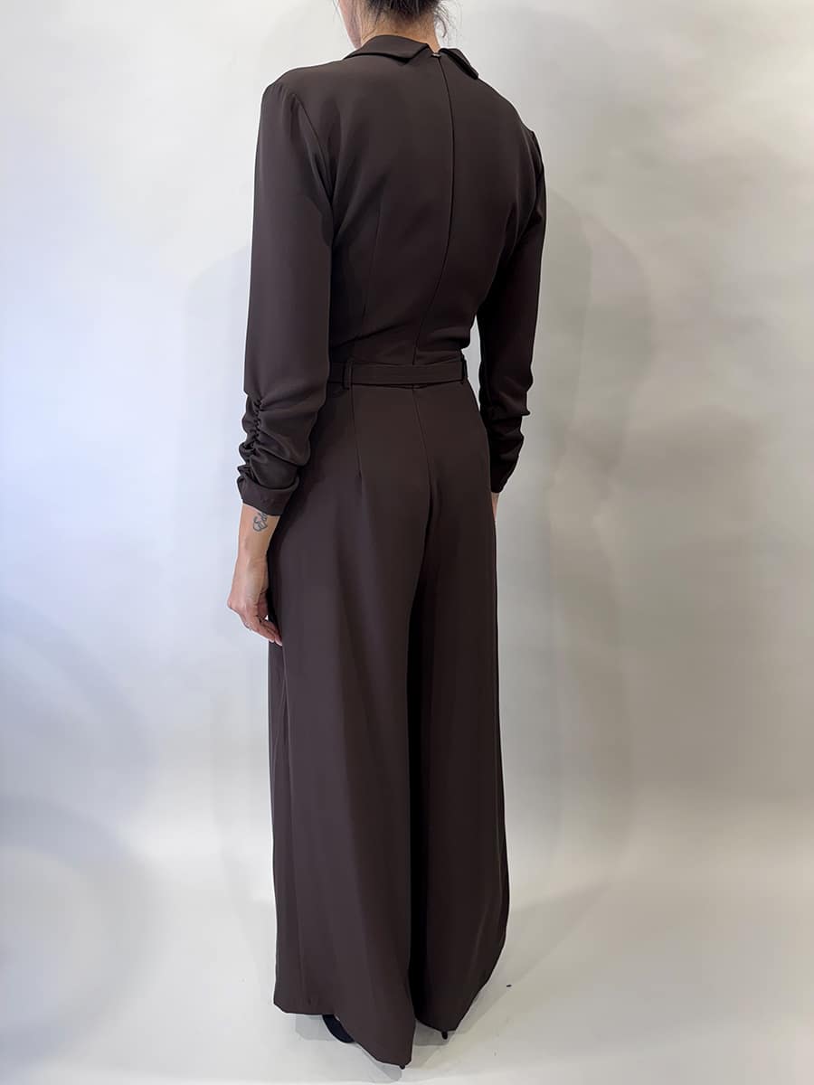 Tuta intera elegante in tessuto fluido color marrone scuro,scollo v con revers ampi e maniche leggermente arricciate sul polso.